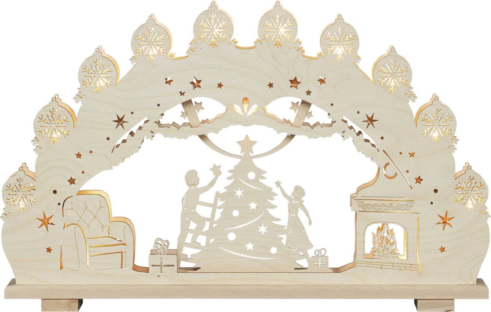 Lichterbogen Weihnachtsbaum, 15flammig Dieser Schwibbogen Weihnachtsbaum ist einzigartig! Die 15-flammige Beleuchtung sorgt für einen schönen 3D-Effekt und setzt den Weihnachtsbaum in der Mitte des Schwibbogens perfekt in Szene. Das Holz ist sorgfältig ausgewählt und die Herstellung erfolgt im Erzgebirge, in Deutschland. Ein echtes Juwel der Holzkunst! Der Weihnachtsbaum mit Kindern als Motiv ist besonders beliebt bei Familien. BxHxT 66x40x6cm NEU |