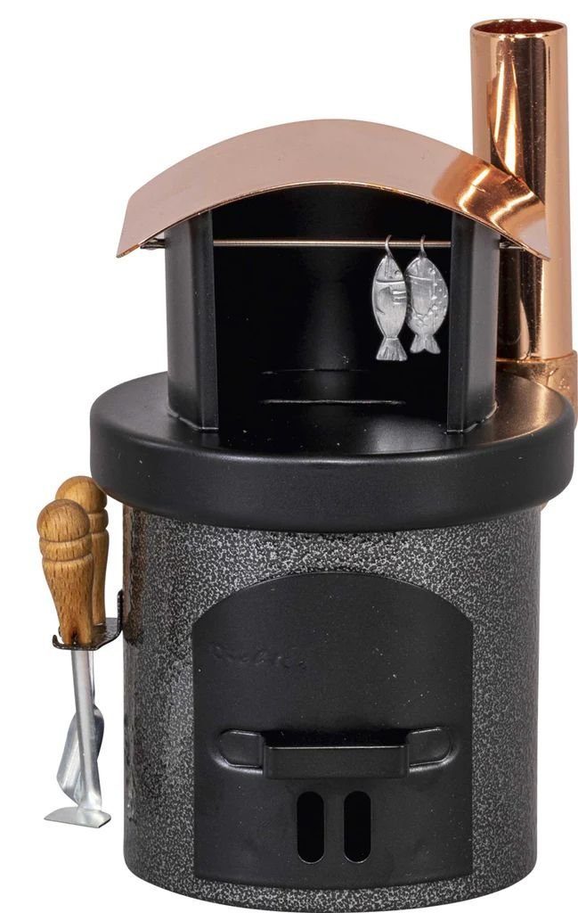 Räucherofen Fischräucherei aus Metall Dieser tolle Räucherofen hat eine Размер von 12,5 cm. Die Figur steht frei auf einem Sockel und hat eine Funktion für normale Räucherkerzen. Im Räucherofen hängen kleine Fischen die frisch geräuchert werden. Die Räucherfigur ist vollständig aus Metall gefertigt und farbig gestaltet. Hinter die kleine Tür im Unterteil wird die Räucherkerze gestellt. Всеs wird in verschiedenen Arbeitsschritten komplett in einem kleinen Betrieb mit langer Tradition hergestellt BxHxT 7,4x12,5x7,5cm NEU |