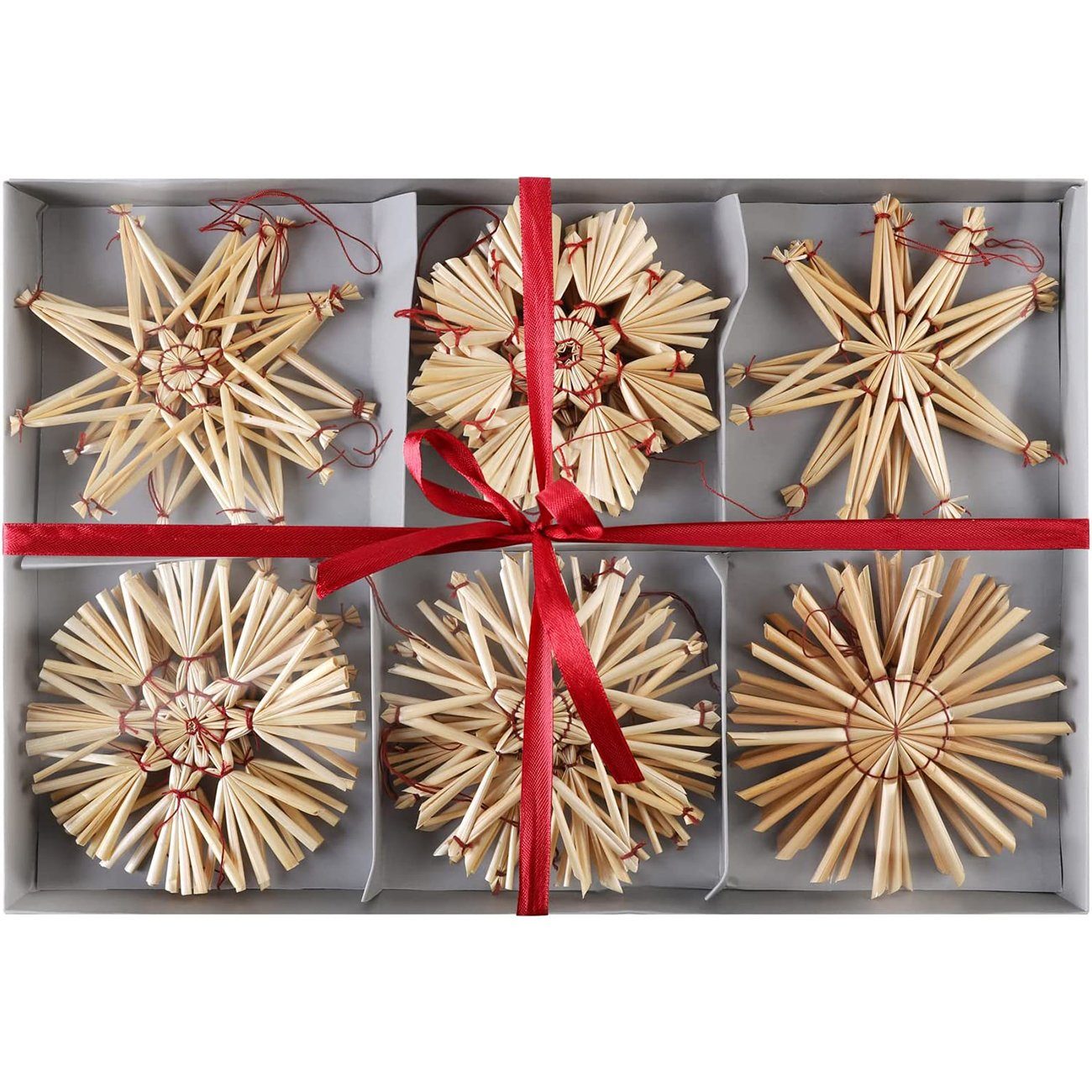Weihnachtsbaumschmuck Set: 24 Schmuckstücke aus Stroh mit verschiedenen klassischen Elementen, die eine weihnachtliche Stimmung beibringen.