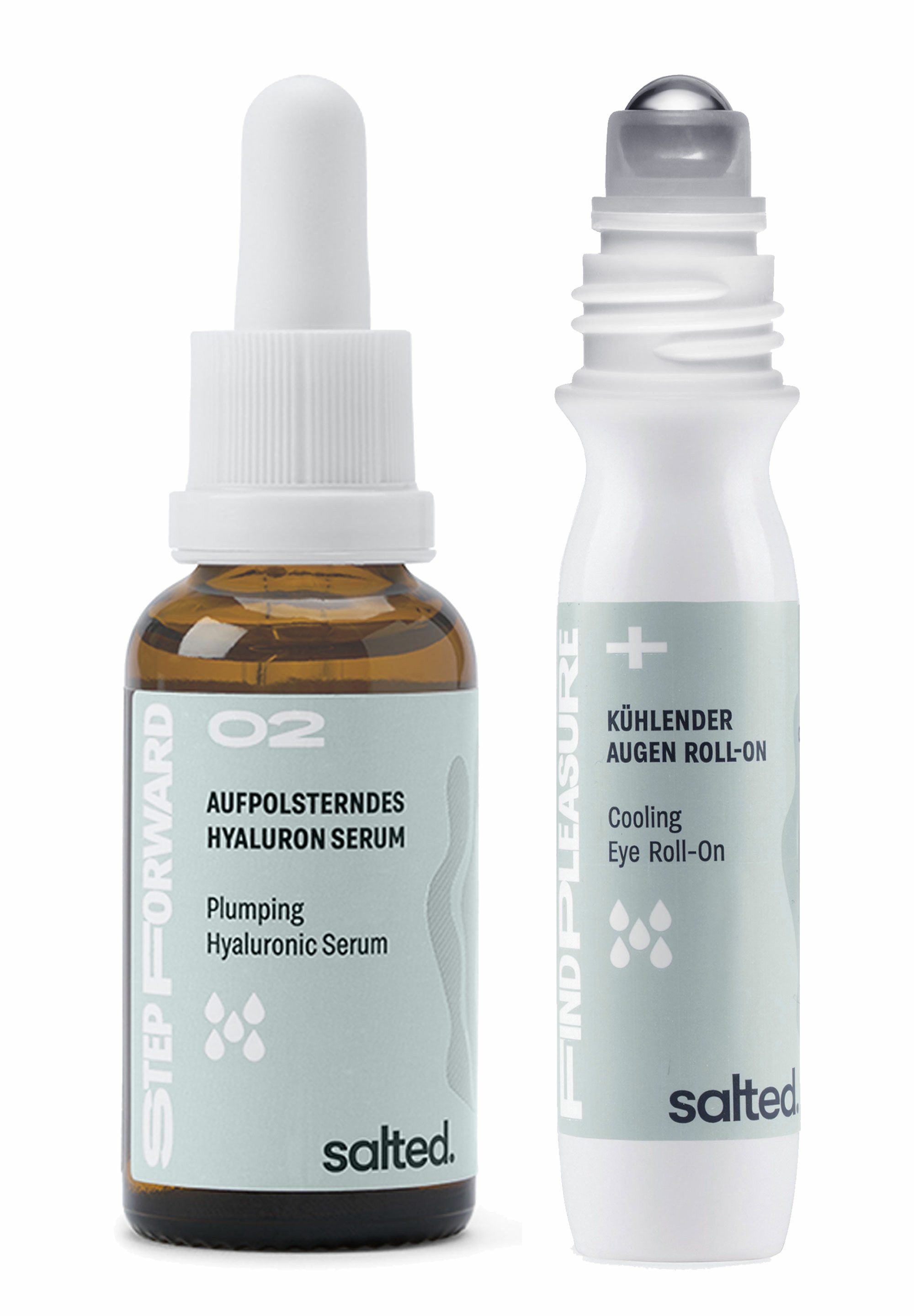Inhaltsstoffe | 02 STEP FORWARD Aufpolsterndes Hyaluron Serum: Aqua (Water), Glycerin, Sodium Hyaluronate, Pentylene Glycol, Panthenol, Sodium Benzoate, Sodium PCA, Potassium Sorbate, Xanthan Gum, Citric Acid, Gracilaria Verrucosa Extract, Sodium Hyaluronate Crosspolymer; + FIND PLEASURE Kühlender Augen Roll-On: Aqua (Water), Glycerin, Niacinamide, Pentylene Glycol, Benzyl Alcohol, Sodium Hyaluronate, Sodium PCA, Sodium Lactate, Allantoin, Ethylhexylglycerin, Chlorella vulgaris Extract, Euphrasia Officinalis Leaf Extract, p-Anisic Acid, Sodium Hydroxide, Dehydroacetic Acid, Citric Acid |