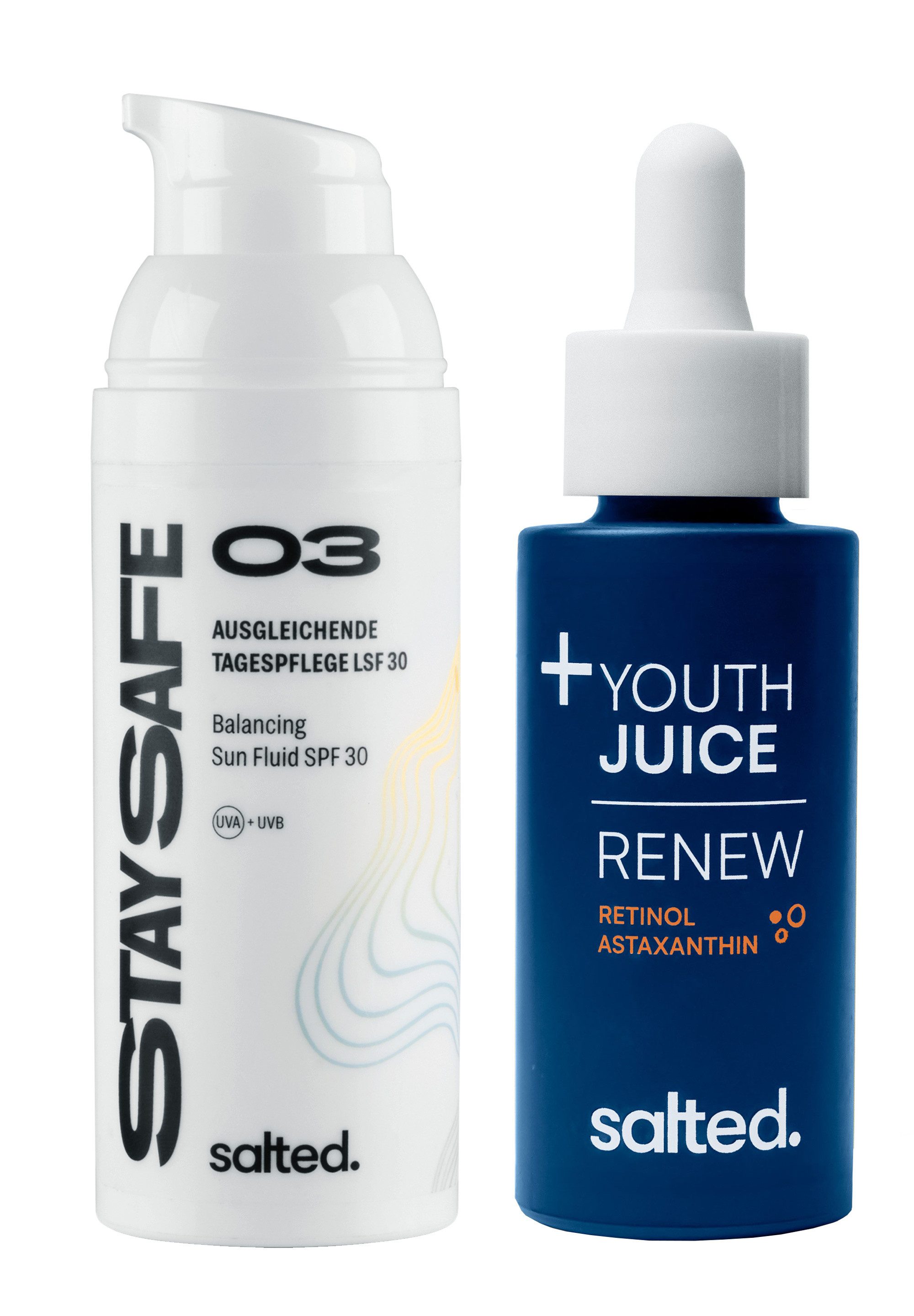 Inhaltsstoffe | Inhaltsstoffe Youth Juice Renew: Aqua, Glycerin, Betain, Hydroxypropyl Cyclodextrin, Diglycerin, Caprylic/Capric Triglyceride, Lauryl Glucoside, Myristyl Glucoside, Polyglyceryl-6 Laurate, Octyldodecanol, Octyldodecyl Xyloside, Retinol, Carthamus Tinctorius Seed Oil, Astaxanthin Oil, Crithmum Maritimum Extract, Chondrus Crispus Extract, Gigartina Stellata Extract, Pentylene Glycol, Tocopherol, Helianthus Annuus Seed Oil, Acacia Senegal Gum, Xanthan Gum, Phenoxyethanol, Propylene Glycol, Decylene GlycolInhaltsstoffe Ausgleichende Tagespflege mit LSF 30: Aqua, Isoamyl laurate, Bis-ethylhexyloxyphenol methoxyphenyl triazine, Ethylhexyl salicylate, Glyceryl stearate citrate, Ethylhexyl triazone, Methylpropanediol, Arginine, Disodium phenyl dibenzimidazole tetrasulfonate, Glycerin, Pentylene glycol, Butylene glycol, Caprylyl glycol, Sclerotium gum, Panthenol, Sodium phytate, Phenylpropanol, Laminaria digitata extract, Citric acid, Hydroxyphenyl propamidobenzoic acid, Potassium sorbate, Sodium benzoate, Ascorbyl palmitate |