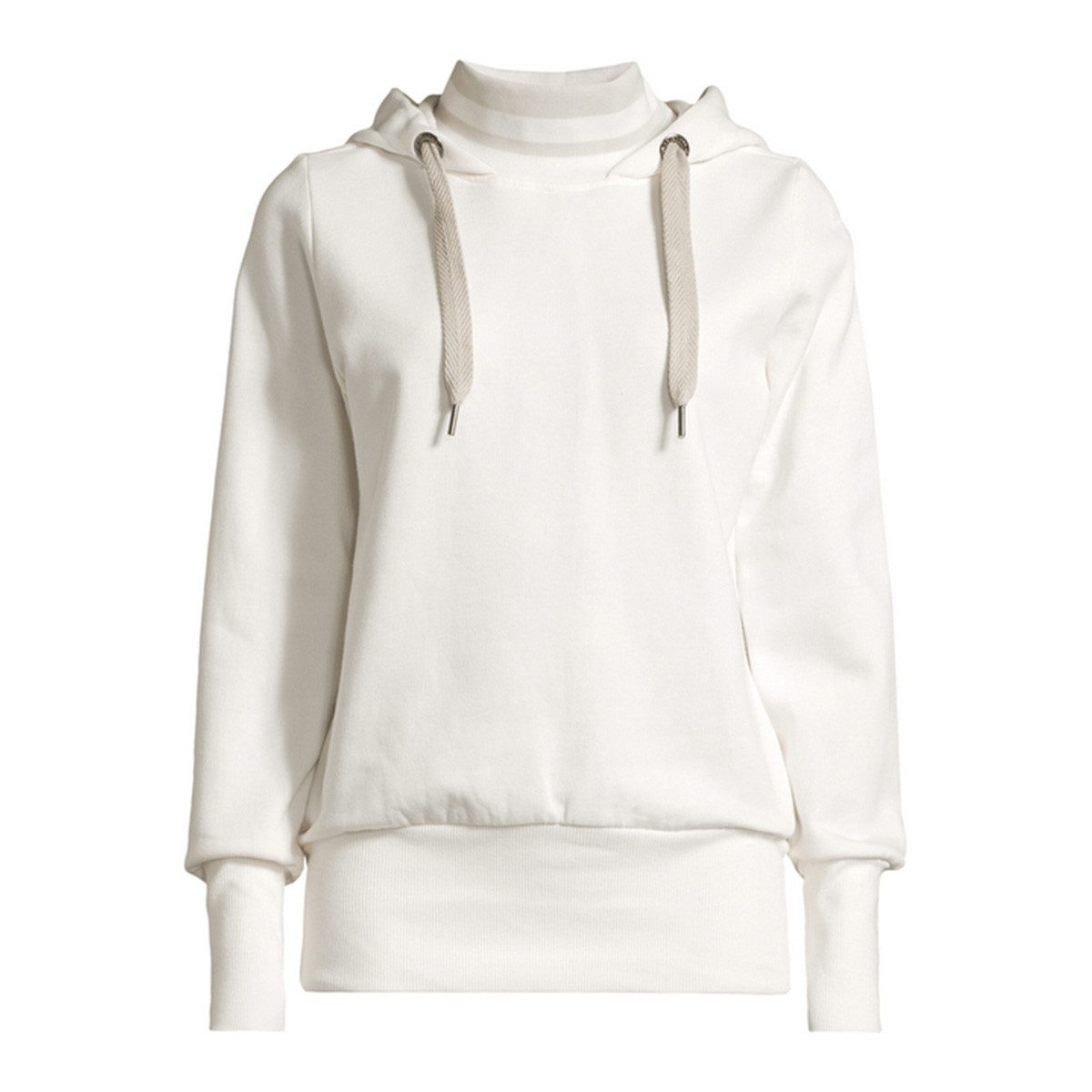 Applikationen | Schlichter 2-in-1 Hoodie mit gestreiftem Stehkragen, dunklen Kordeln, breiten Bündchen und Daumenlöchern |