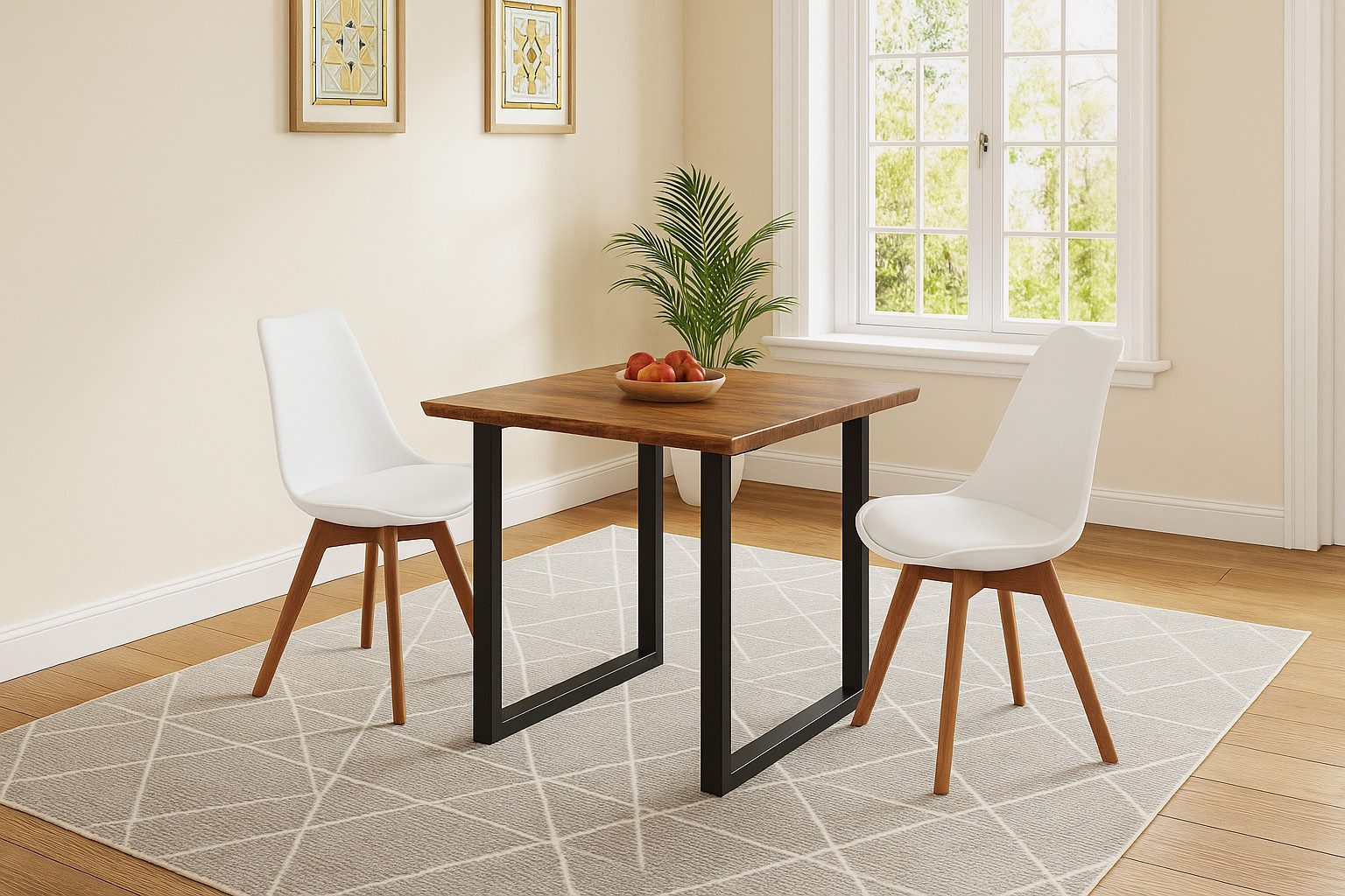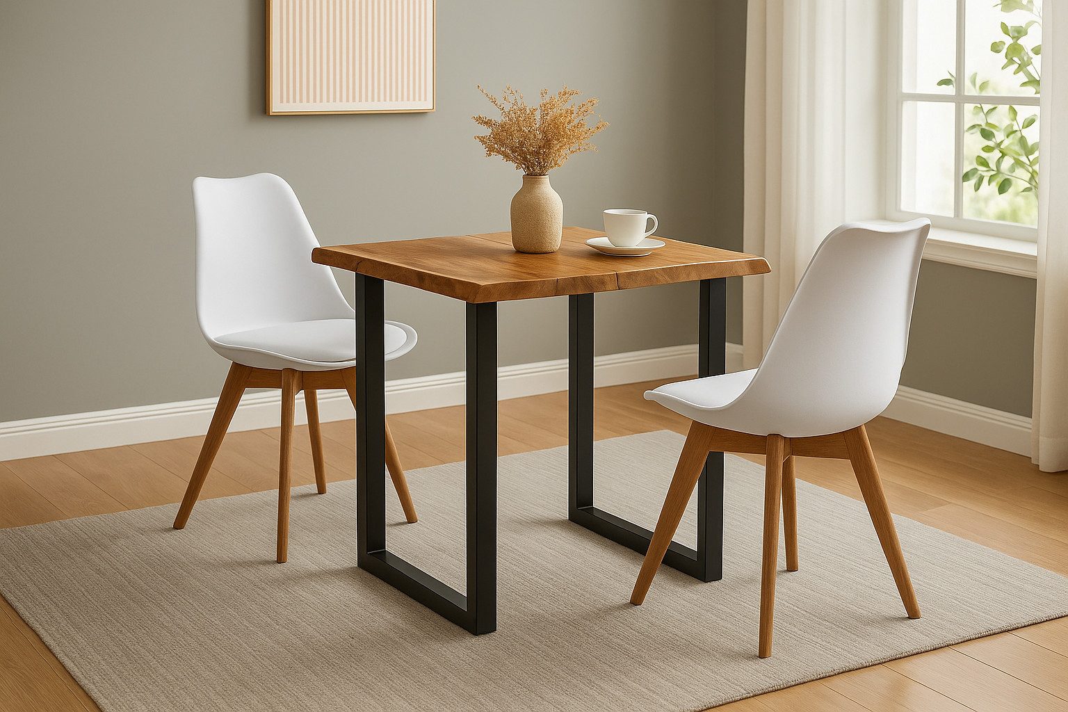 Die zwei Stühle Lovely sind mehr als nur hübsch. Die ergonomische Sitzschale aus weißem Kunststoff ist pflegeleicht und angenehm geformt – ideal für lange Gespräche oder kurze Snacks zwischendurch. Dank des gepolsterten Kunstlederkissens sitzt Du weich und bequem, das akazienfarbene Vierfußgestell aus Massivholz sorgt für Stabilität und fügt sich optisch harmonisch in das Tischdesign ein.