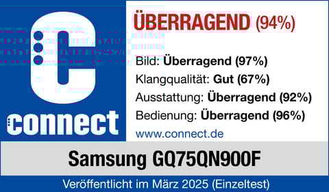Das Onlinemagazin „connect.de“ testet den Samsung GQ75QN900F im Einzeltest. Das Bild ist „überragend“: Es bietet u. a. eine „extrem hohe 8K-Ausflösung“. Auch der „gute“ Klang überzeugt. Der Fernseher ist „überragend“ ausgestattet, u. a. mit tollen KI-Extras. Außerdem erhält auch die sehr komfortable Bedienung die Wertung „überragend“. Das Gerät erreicht das Gesamtergebnis „ÜBERRAGEND (94 %)“ (von max. 100). Die QN900-Serie bildet „Samsungs Speerspitze der TV-Technik“.