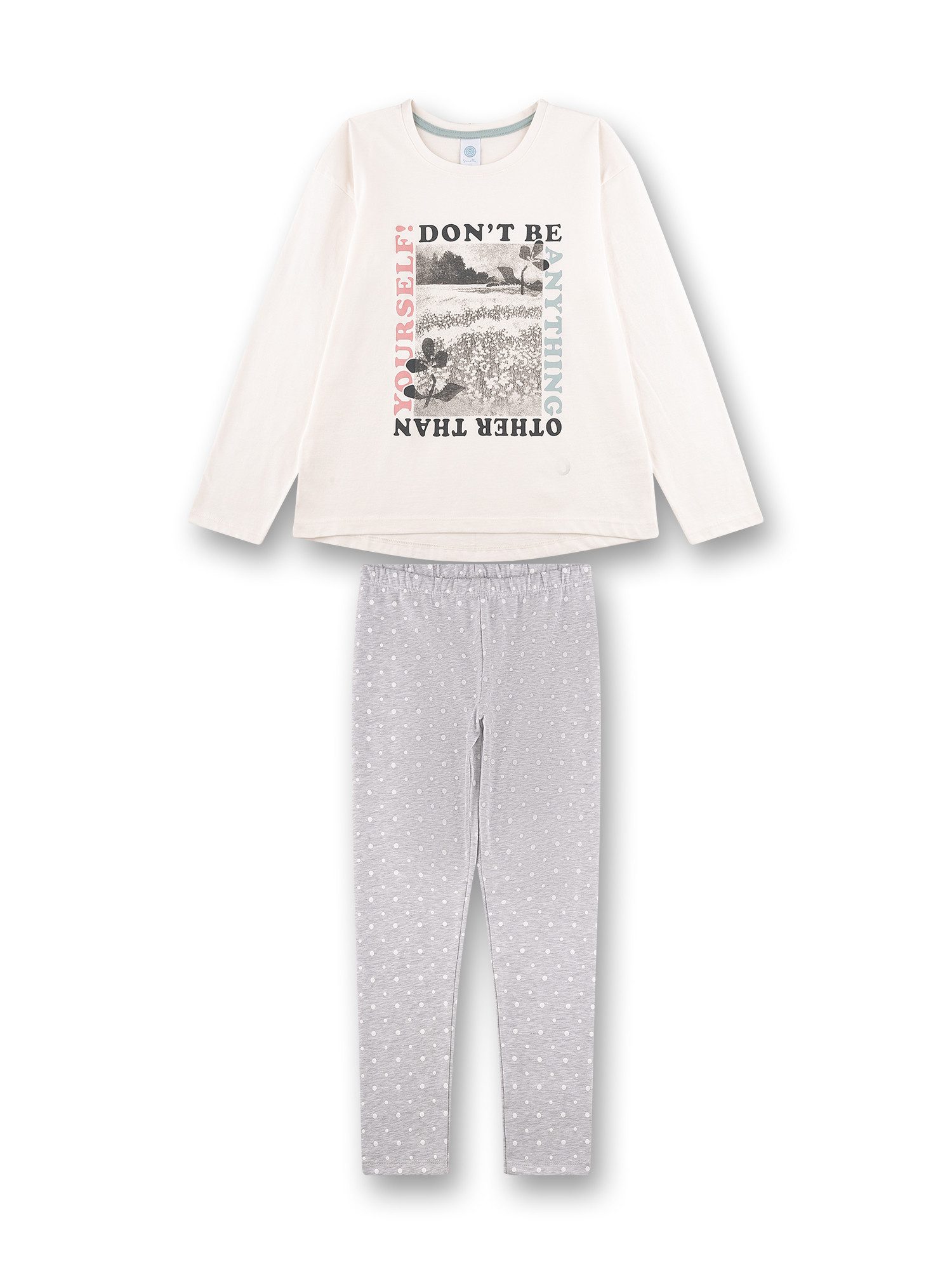 Dieser Mädchen-Schlafanzug aus 100% Baumwolle vereint Komfort und stilvolles Design. Das cremefarbene Oberteil mit langen Ärmeln trägt den inspirierenden Schriftzug "DON'T BE ANYTHING OTHER THAN YOURSELF" und ein zartes Blumenwiesen-Motiv, während die graue Hose mit feinem Allover-Punktmuster den Look harmonisch abrundet. Der weiche Stoff schmiegt sich angenehm an die Haut, der lockere Schnitt und der elastische Bund sorgen für Bewegungsfreiheit und hohen Tragekomfort. Ein Lieblingsstück, das Geborgenheit, Stil und kindliche Freude perfekt vereint - ideal für entspannte Nächte und süße Träume. - 100 % Baumwolle, weich & anschmiegsam für Mädchen - Cremefarbendes Oberteil mit inspirierendem Schriftzug & Blumenmotiv - Graue Hose mit freinem Allover- Punktmuster - Lockere Passform & elastischer Bund - Komfortabel, stilvoll & verspielt
