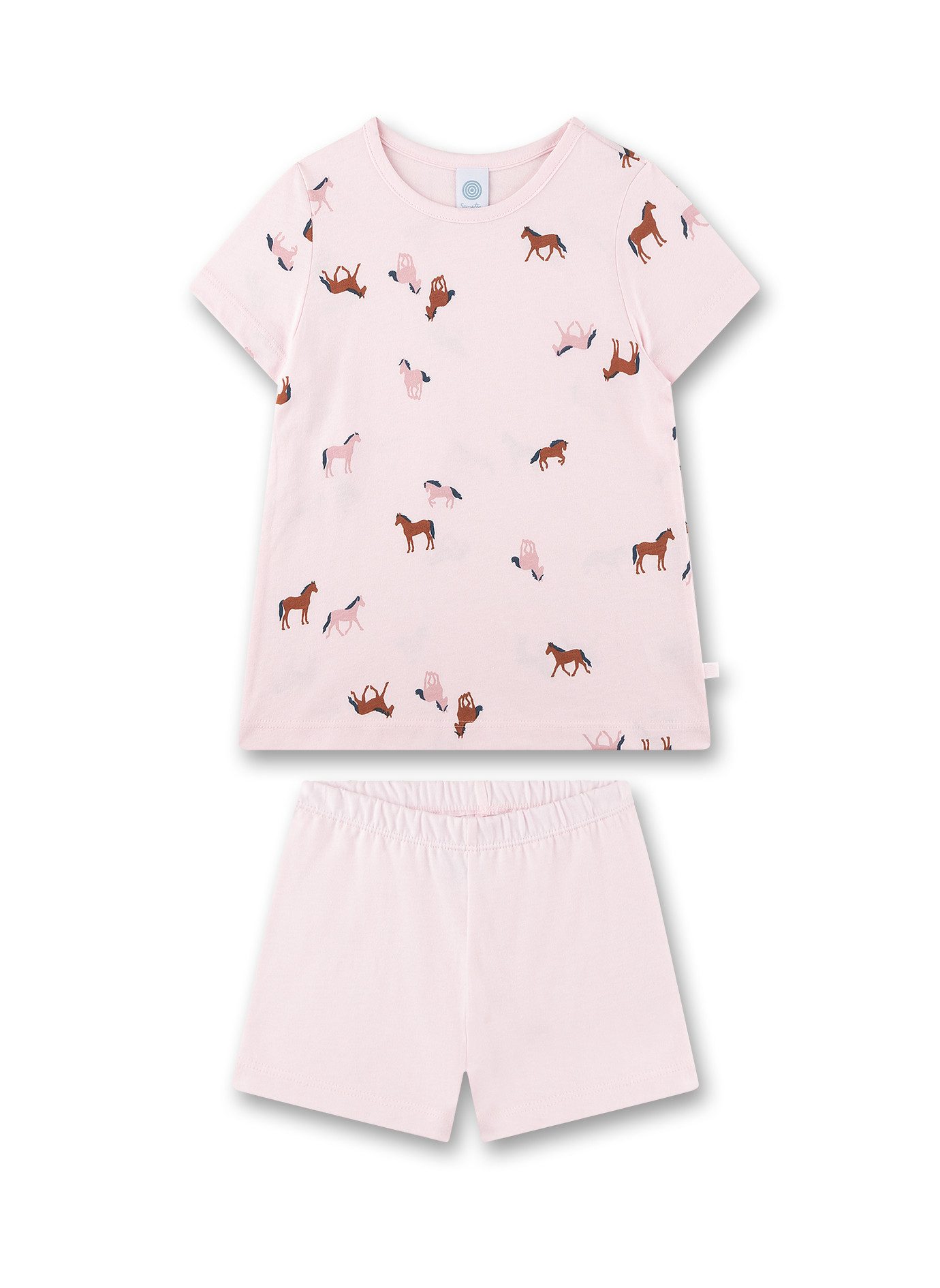 Hübscher kurzer Mädchen-Schlafanzug von Sanetta in einem dezenten Rosa mit einem trendigen Pferde-Allover auf dem Schlaf-Shirt. - angenehme und weiche Single-Jersey Qualität aus 100% Baumwolle - T-Shirt mit einem angesagten Pferde-Allover in einem dunklen Rosa, Braun und Blau - einfarbige Schlafhose in Rosa mit bequemen Beinbündchen und elastischem Gummibund am Bauch - hochwertige Verarbeitung und Materialien garantieren einen äußerst bequemen Tragekomfort - pflegeleicht und trocknerbeständig