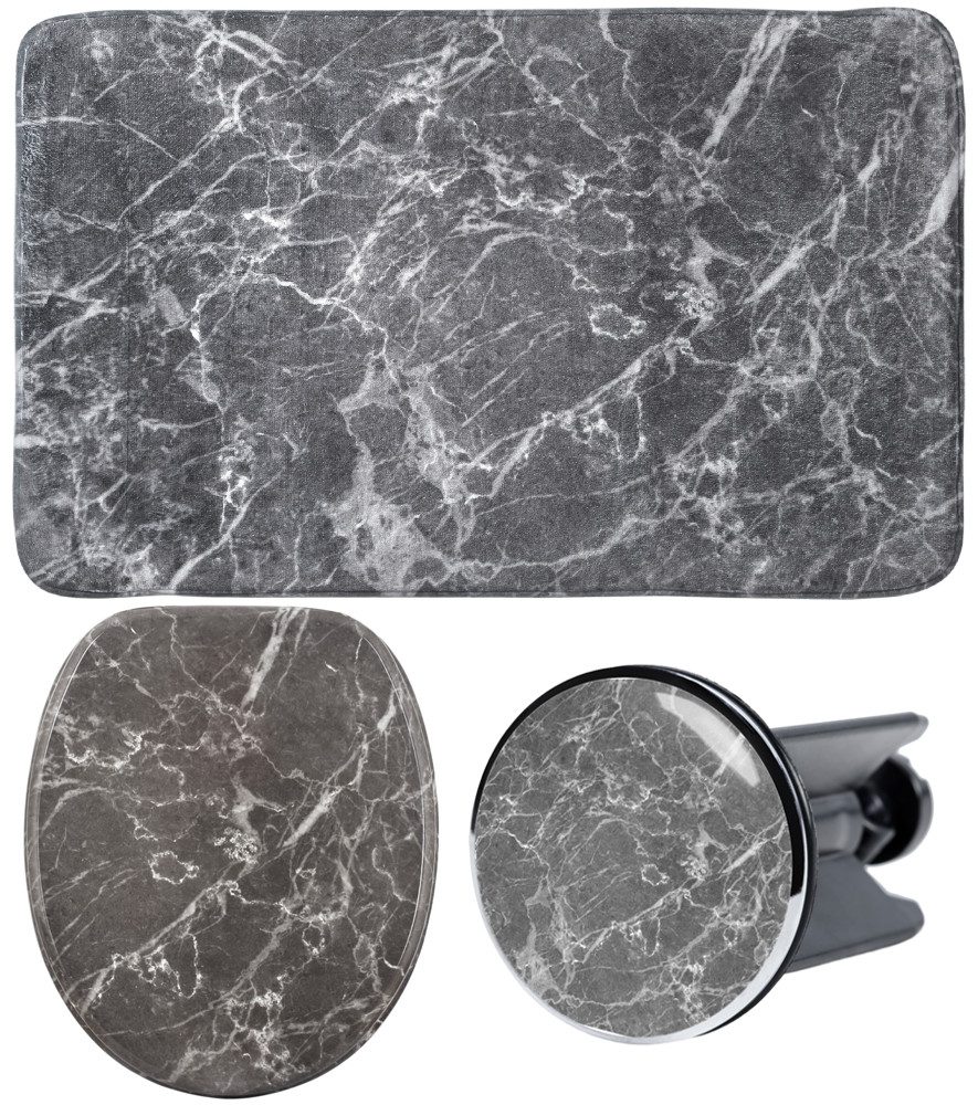 Sanilo Badaccessoire-Set 3-teilig Marmor Grau, WC-Sitz mit Absenkautomatik, Badteppich 70 x 110 cm, Waschbeckenstöpsel, 3 tlg., hochwertig & modern, universell, leichte Montage