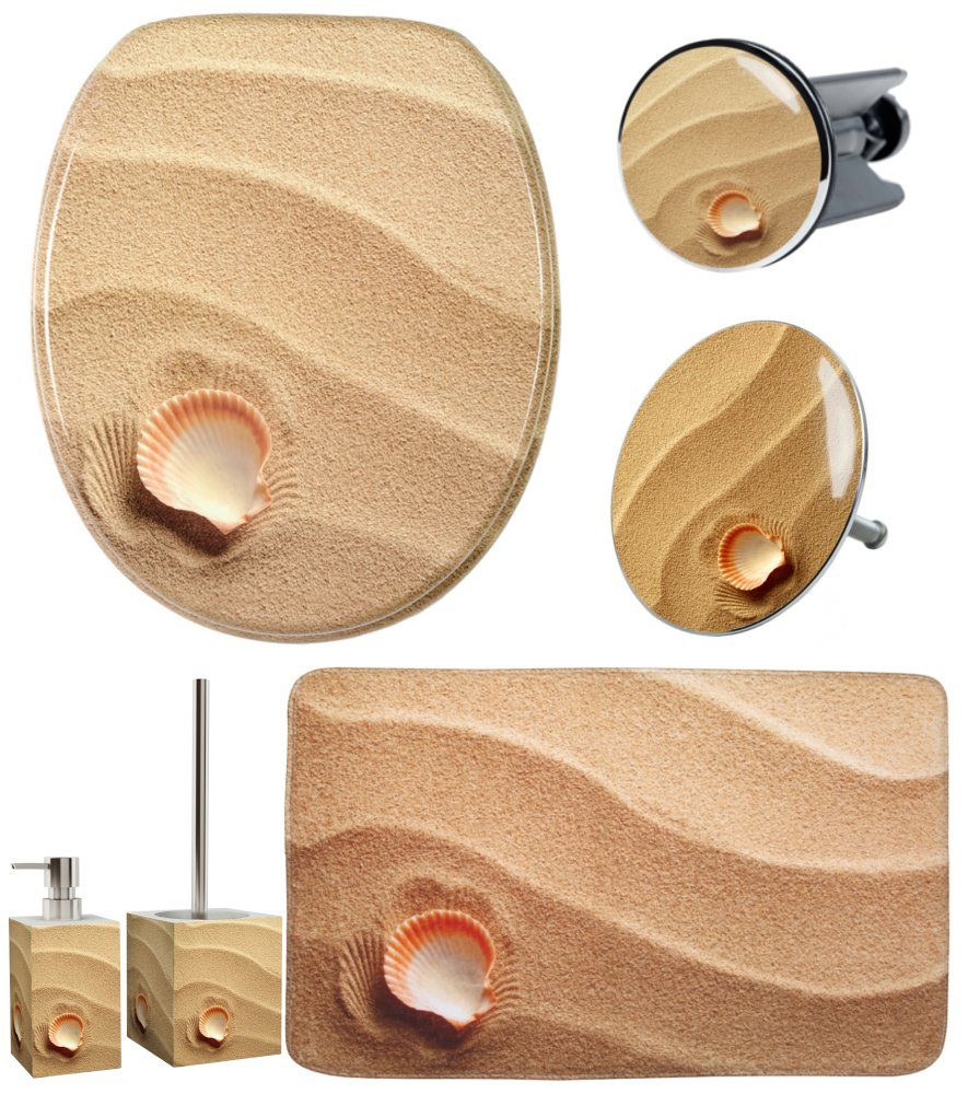 WC-Sitz, Badteppich 70 x 110 cm, Waschbeckenstöpsel, Badewannenstöpsel, Seifenspender und WC-Bürste