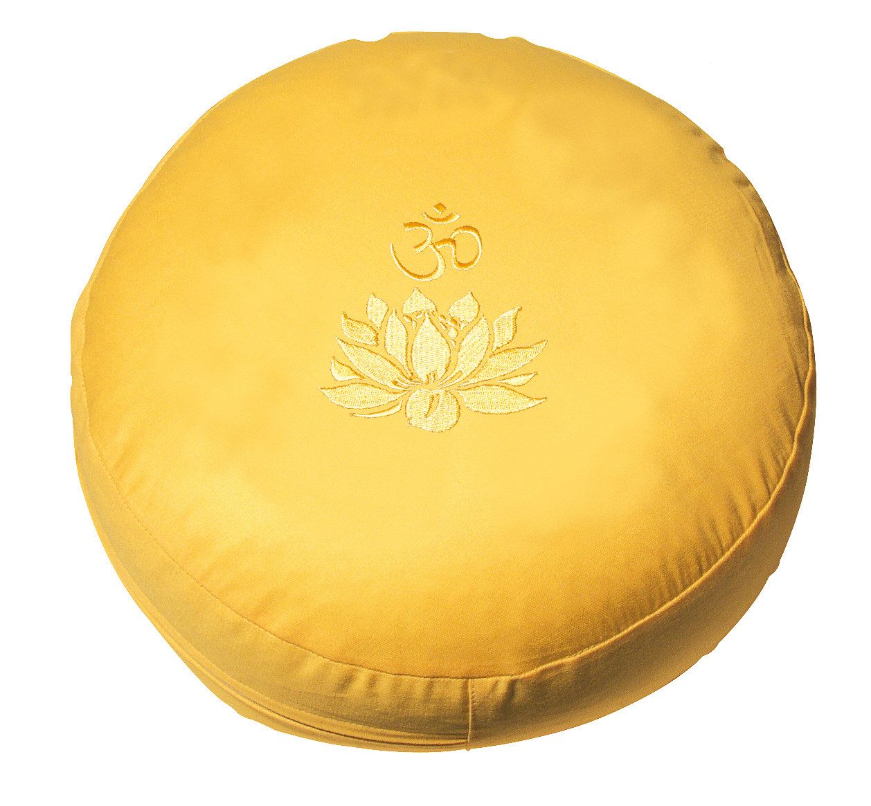 Meditationskissen mit Inlett "Lotus Om" Baumwolle (80%), Polyester (20%) goldgelb, rund 35cm (Sitzhöhe ca.15-17cm) mit hochwertigem Bio-Dinkelspelz gefüllt