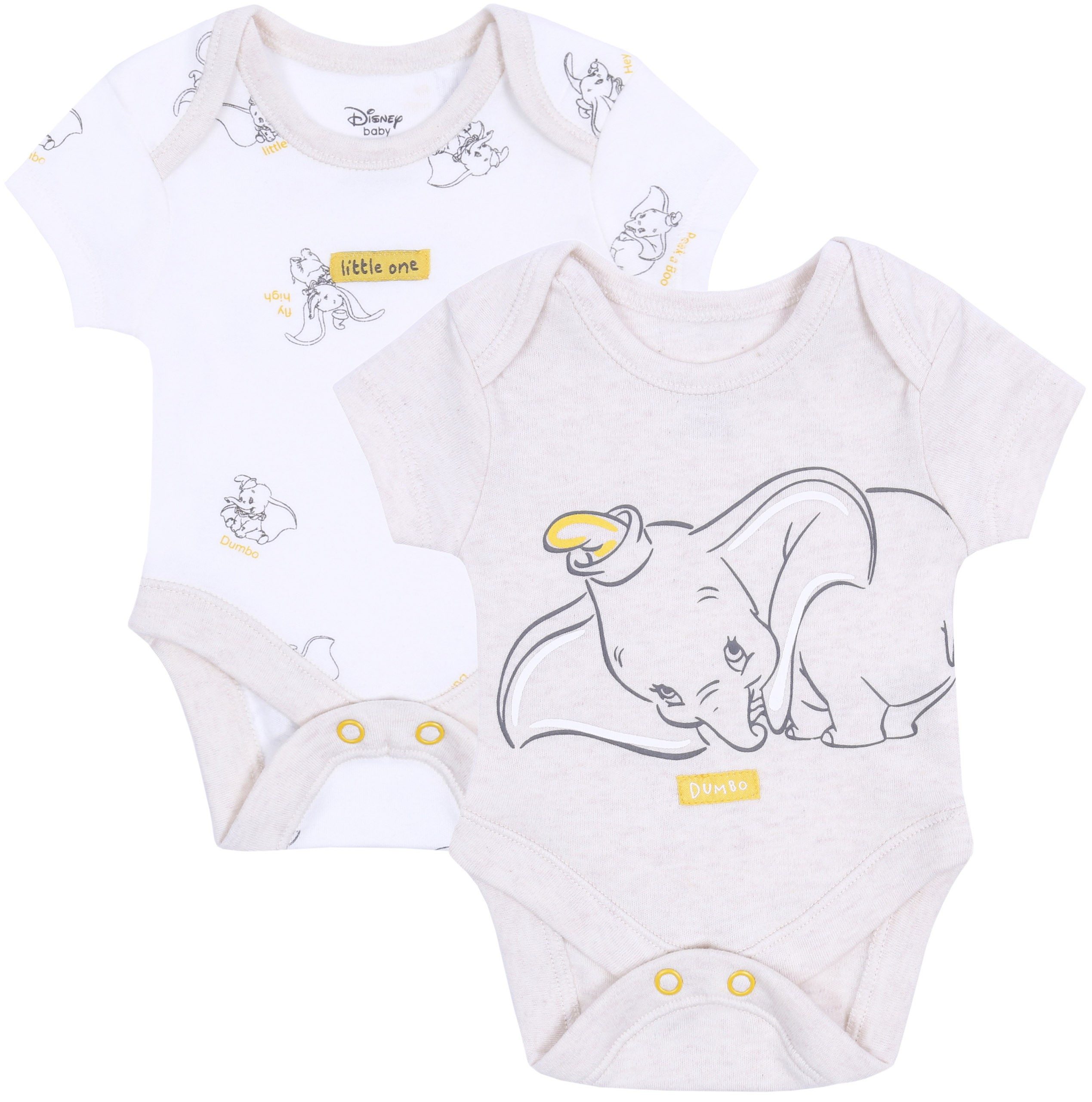 Das Set besteht aus zwei Stück beige-weißer Body für Baby mit der sich wiederholender Abbildung des Dumbo Elefanten.