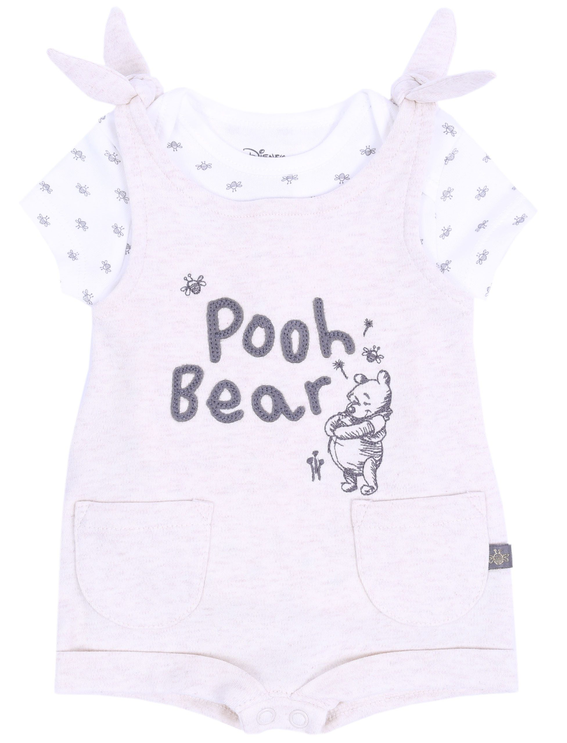 Babyset mit beigefarbenem Strampler und weißem Body mit kurzen Ärmeln.