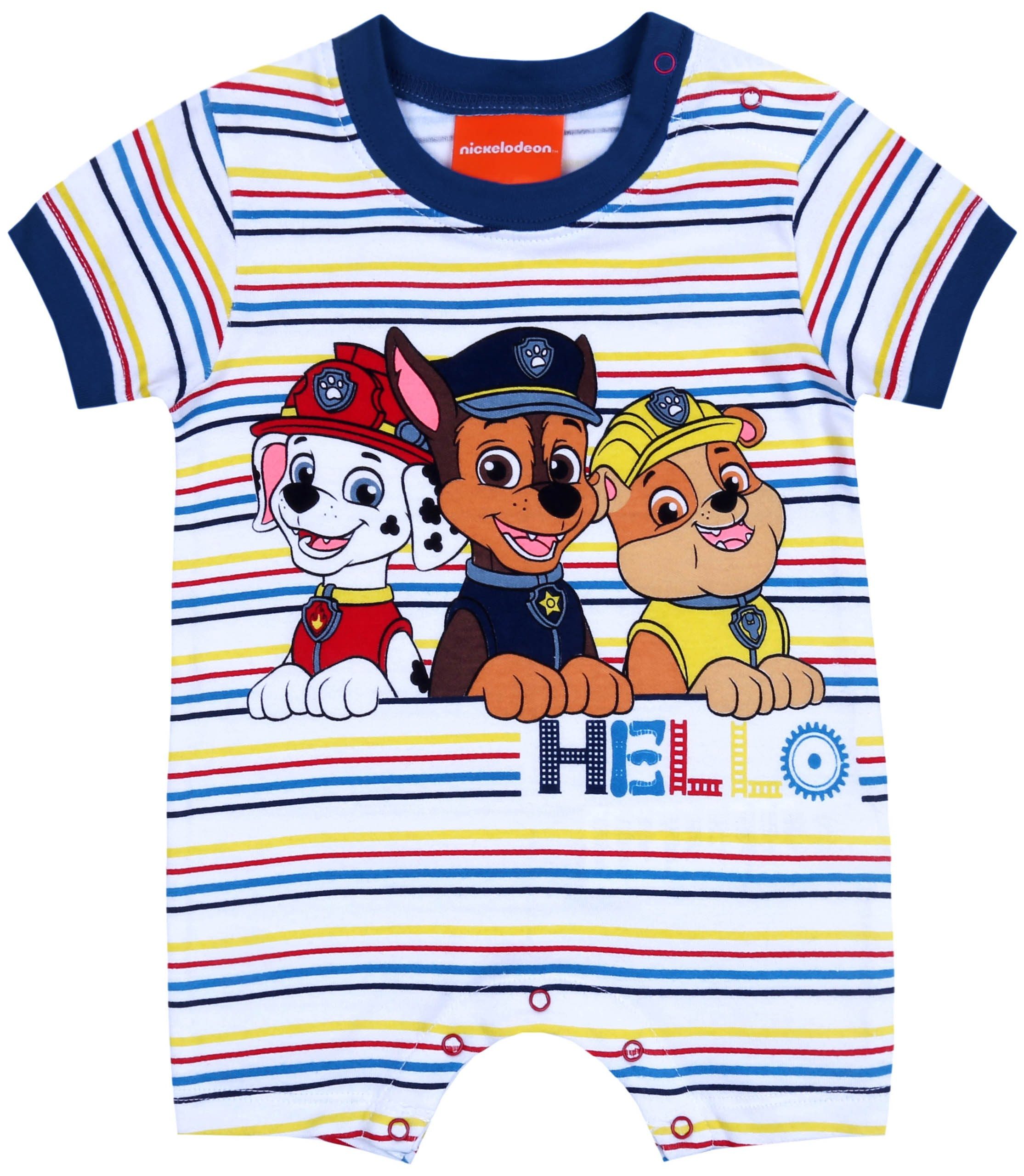 Weißer Jungen-Strampler mit bunten Streifen mit Motiv von der Zeichentrickserie Paw Patrol.