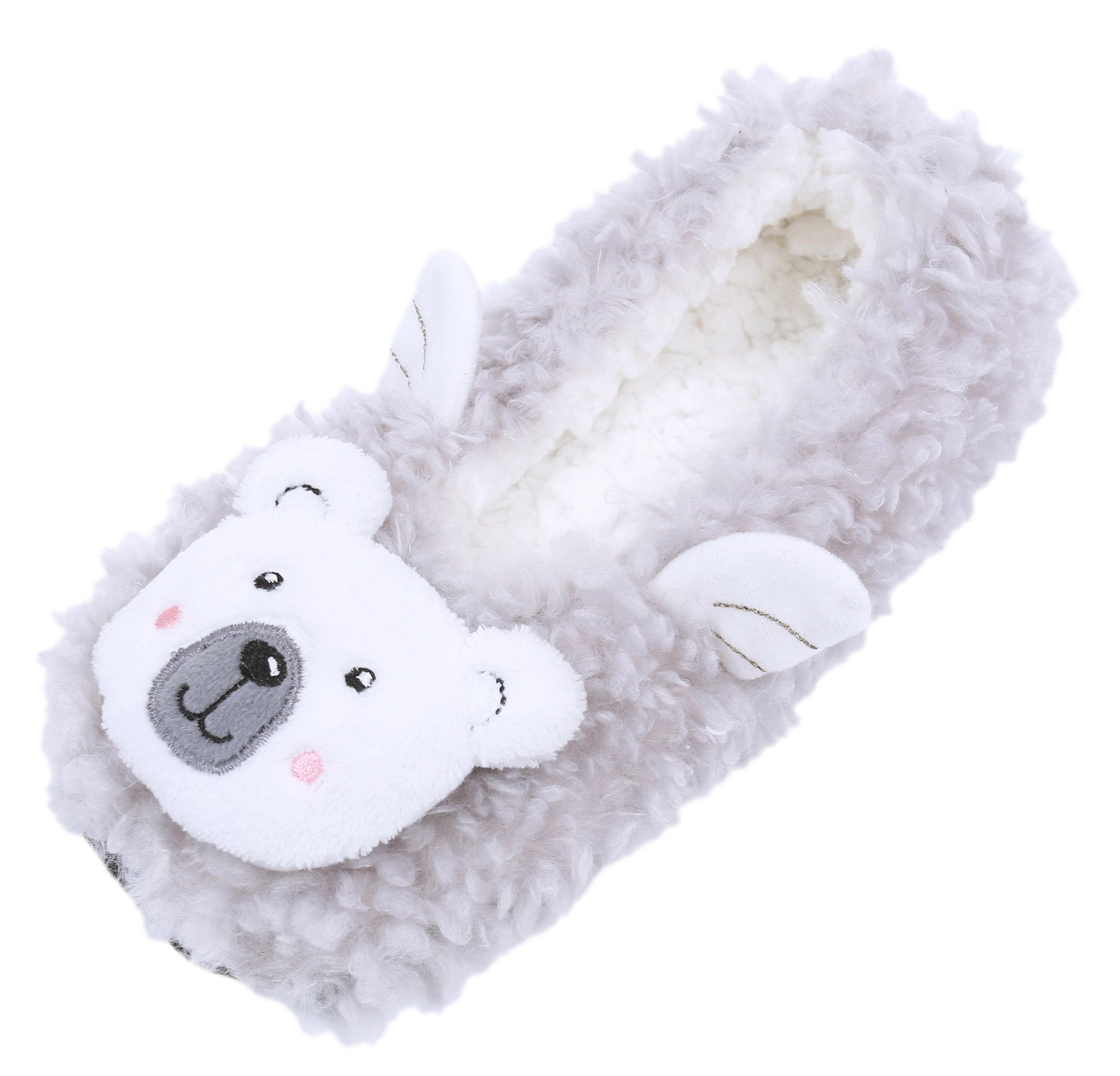 Hellgraue, zottige Hausschuhe Typ Fußlinge, hergestellt aus einem weichen und sich gut anfühlenden Stoff.
