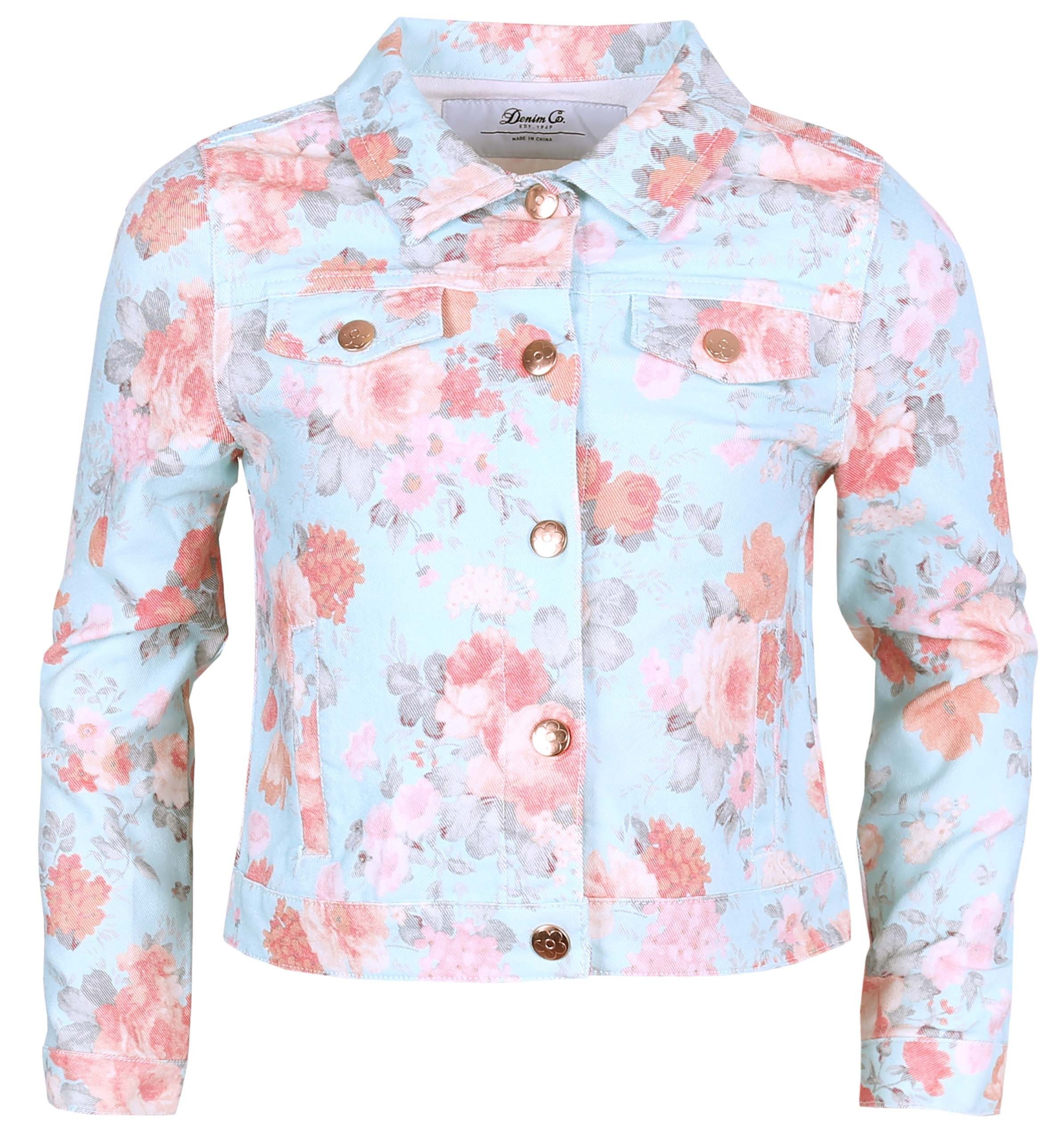 In hellblauer Farbe mit bunten Blumen gemustert.