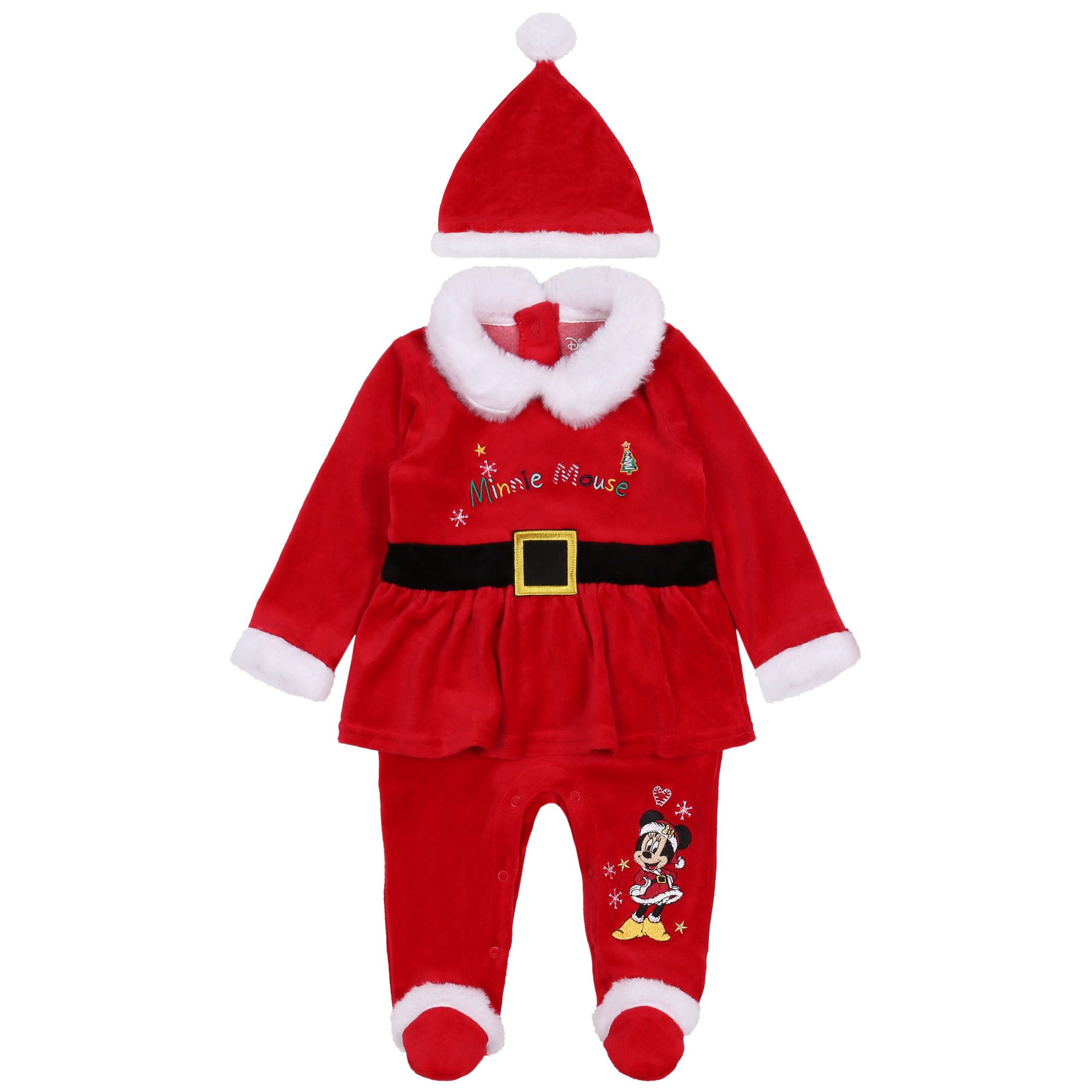 Weihnachtsset aus Velours für Baby besteht aus einem Strampler und einer Mütze, nach dem Vorbild von Nikolaus.