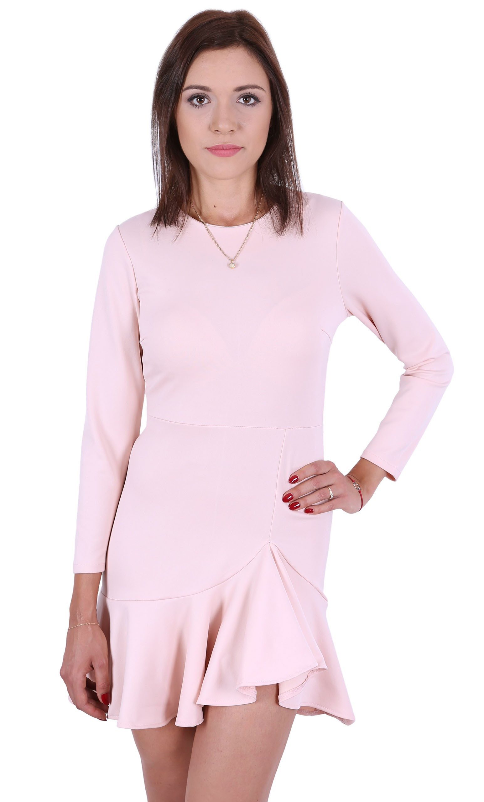 Kleid in Farbe puderrosa, mit langen Ärmel, mit Reißverschluss.