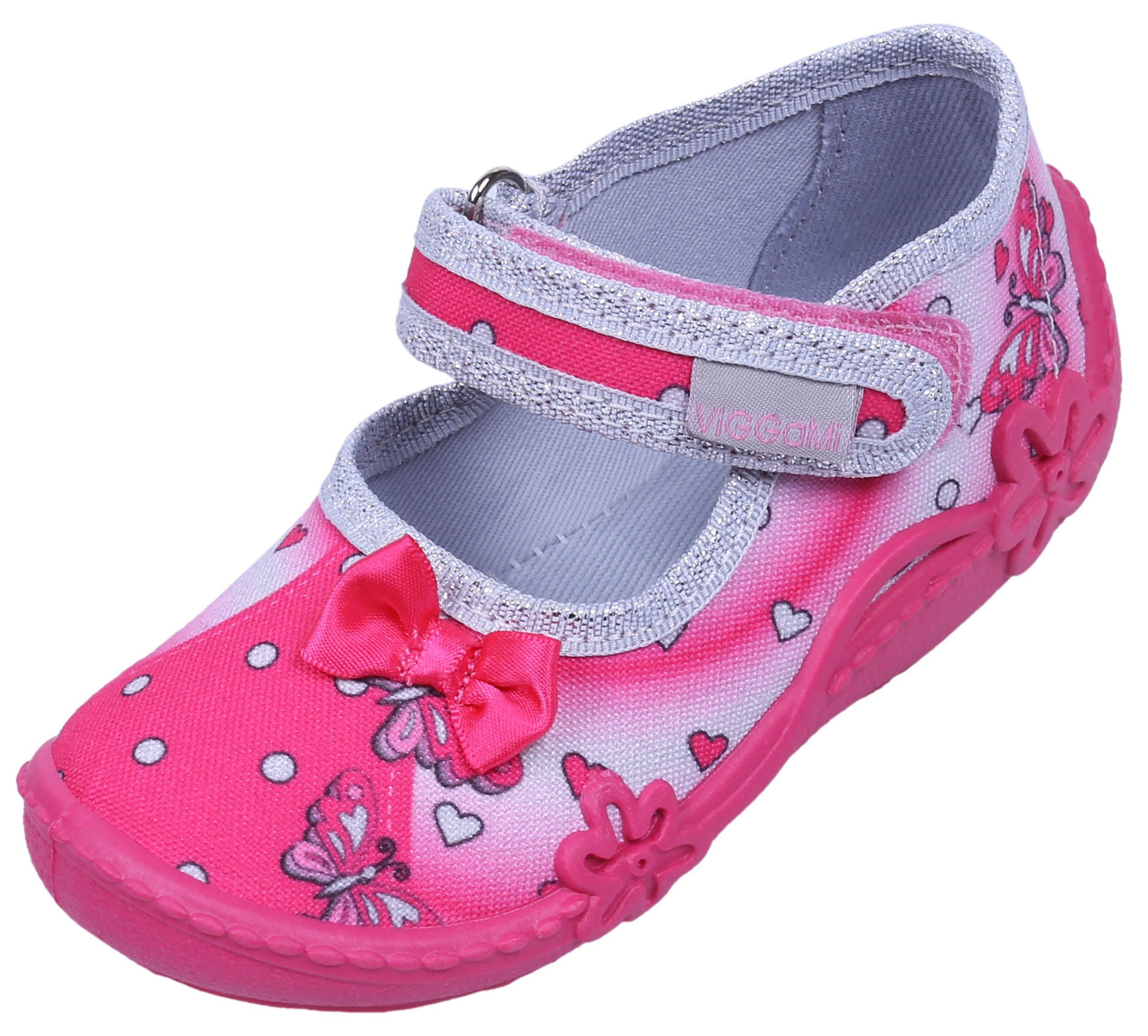 Schöne, pink-silberfarbene Pantoffeln mit Herzen/Schmetterlingen, in Polen hergestellt.