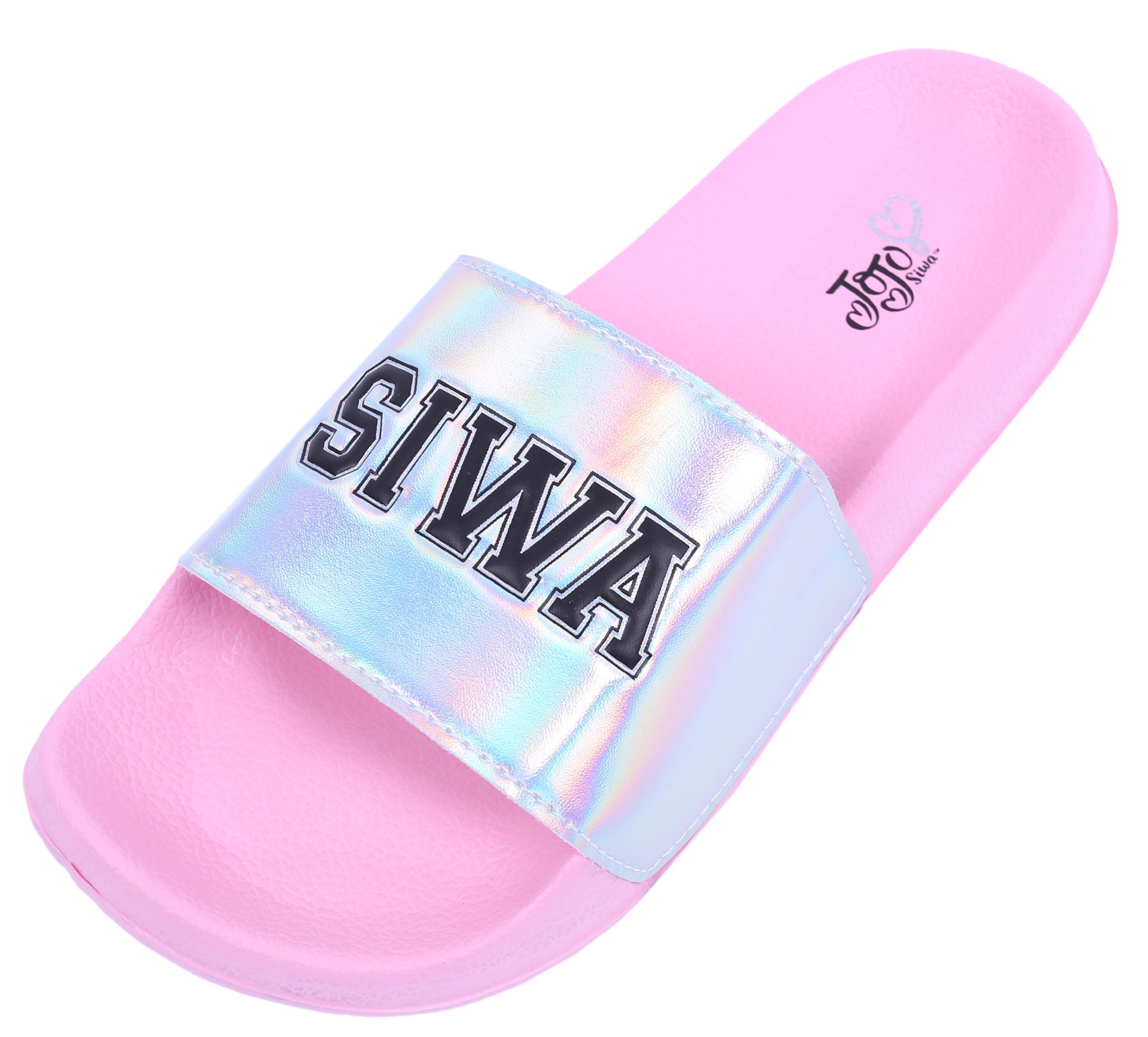 Pink-silberfarbene Flip-Flops mit Spiegeleffekt und Motiv der Tänzerin und Sängerin - Jojo Siwa.