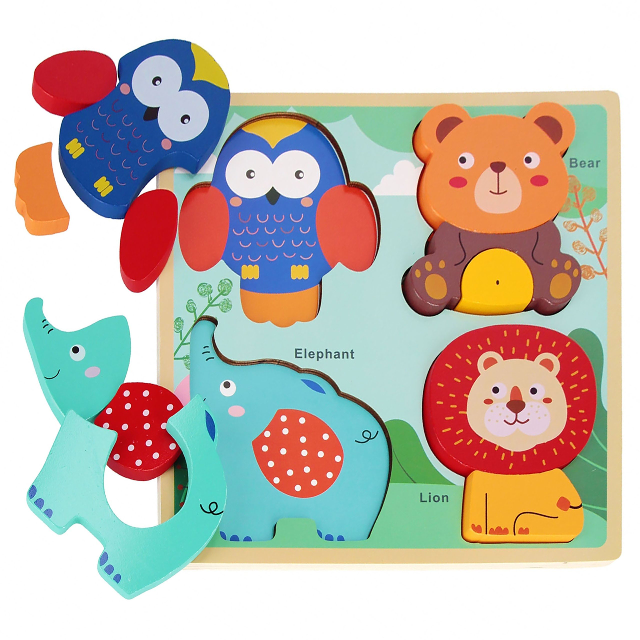 Das Set enthält freundliche Tiere wie Eule, Bär, Elefant und Löwe, die den ausgeschnittenen Formen auf dem Brett zugeordnet werden können.