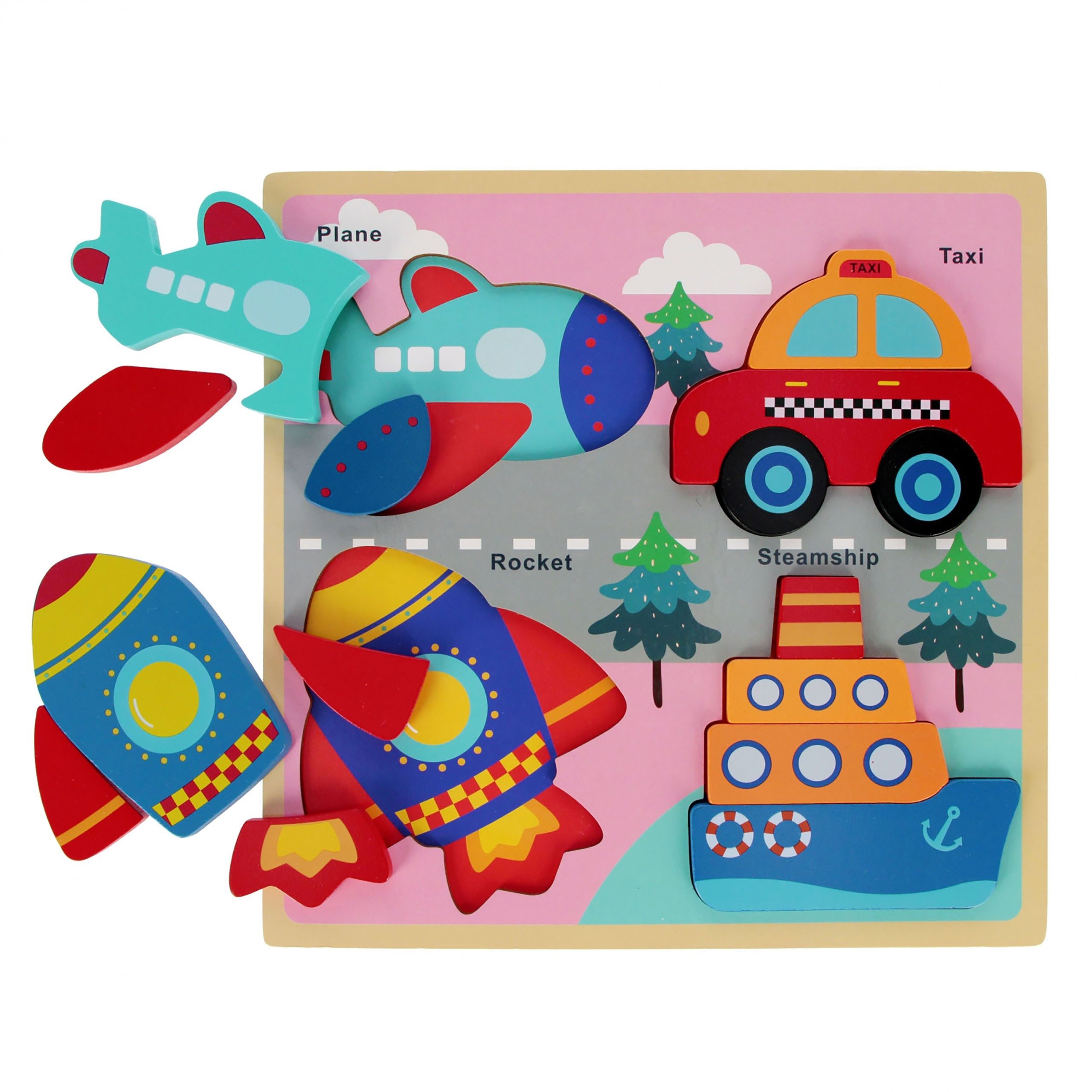Das Set enthält Fahrzeuge wie ein Flugzeug, ein Taxi, eine Rakete und ein Schiff, die in die ausgeschnittenen Formen auf dem Spielbrett eingepasst werden können.