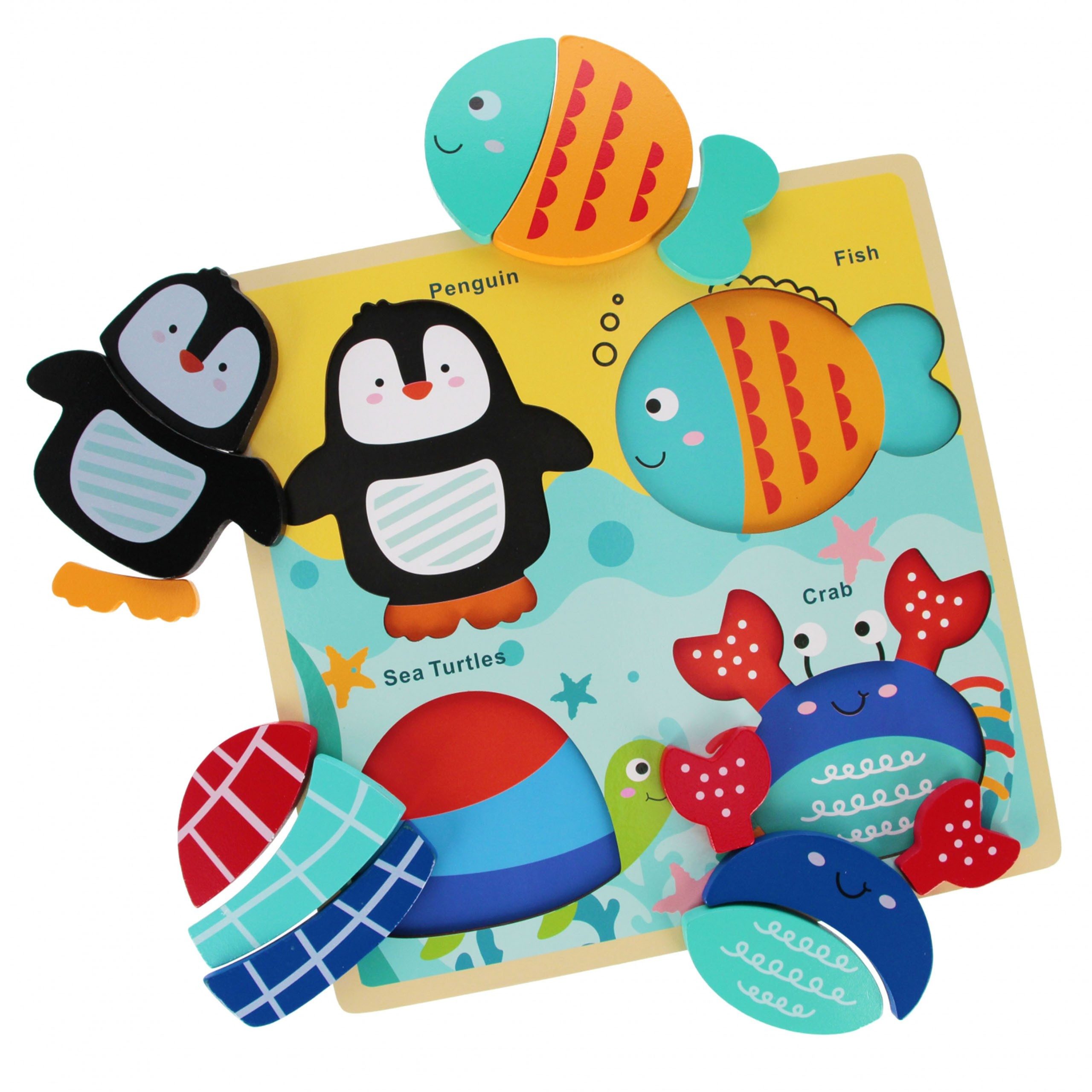 Das Set enthält freundliche Meeresbewohner wie einen Pinguin, einen Fisch, eine Krabbe und eine Schildkröte, die in die ausgeschnittenen Formen auf dem Brett eingepasst werden können.