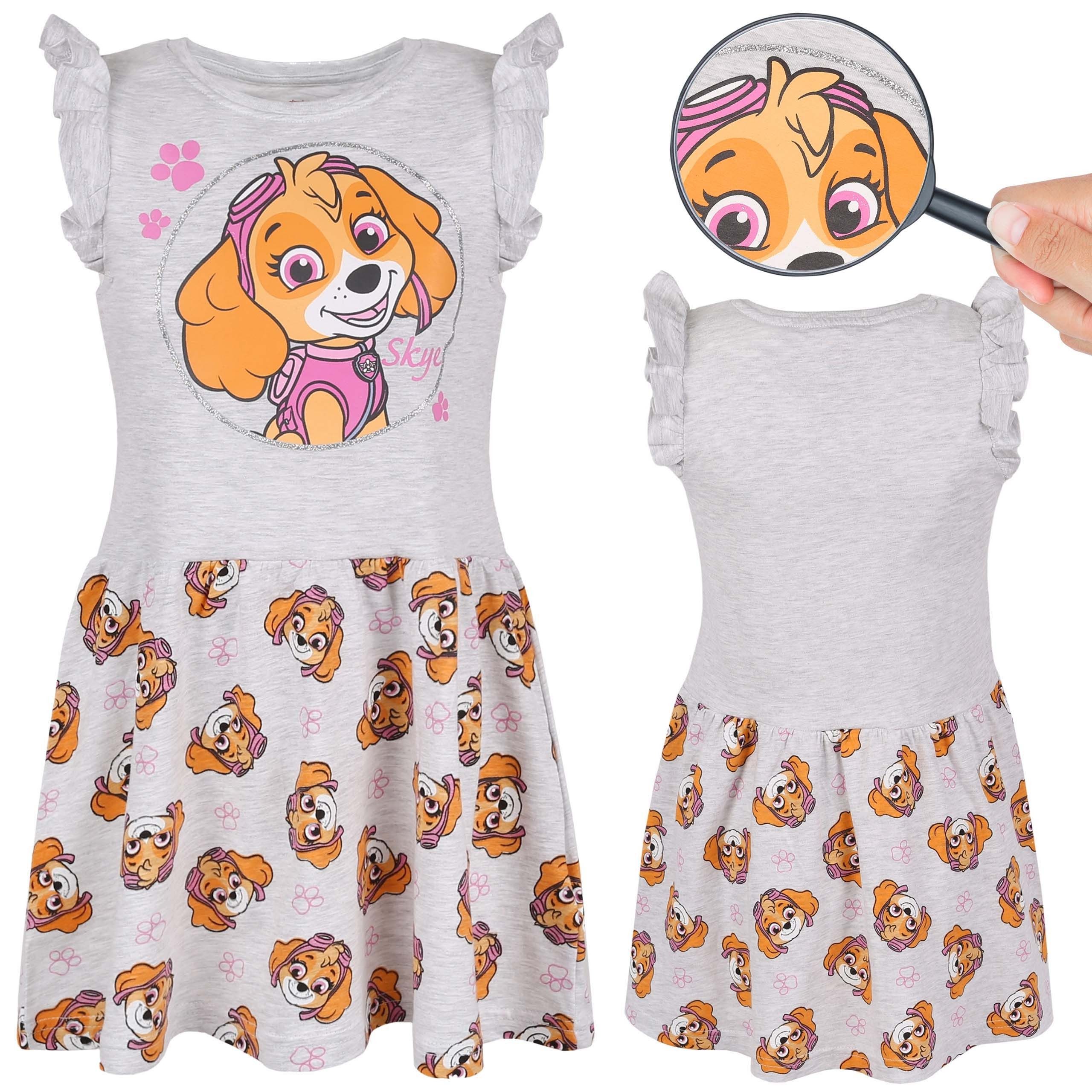 Das Mädchenkleid mit der Paw Patrol-Zeichentrickfigur Skye ist eine süße Sommer-Option für kleine Abenteuerfans. Ein heller Hintergrund mit einem zarten Muster und Skyes sich wiederholendes Smiley-Gesicht sorgen für ein fröhliches, märchenhaftes Design. Das Kleid hat kurze Ärmel mit einem Rüschendetail, das einen mädchenhaften Charme und Leichtigkeit verleiht. Es ist aus einem weichen, luftigen Stoff gefertigt, perfekt für warme Tage. Sie eignet sich sowohl für den Alltag als auch für Urlaubsreisen oder Familientreffen.