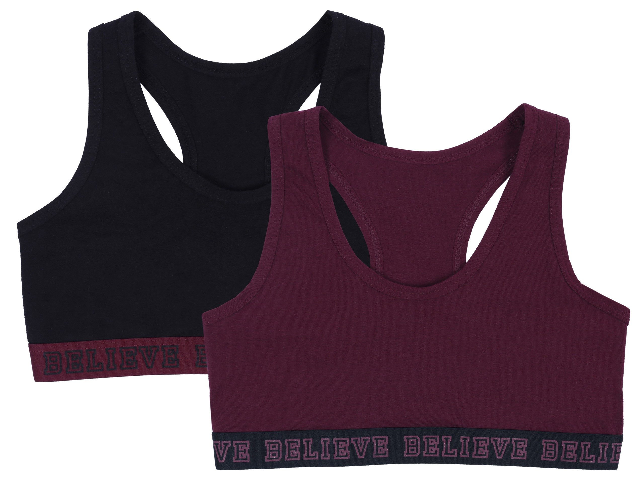 Set aus zwei Jugend-Sport-Tops für Mädchen in den Trendfarben Burgunderrot und Schwarz. Sie sind aus weichem und dehnbarem Material gefertigt und sorgen für Komfort bei körperlichen Aktivitäten. Der Schriftzug "Believe" auf dem elastischen Band unter der Brust sorgt für einen modischen und motivierenden Touch. Ideal für Freizeitkleidung oder zur Ergänzung einer sportlichen Garderobe. Das kastenförmig geschnittene Oberteil bietet volle Bewegungsfreiheit. Alter / Größe: 7-8 Jahre / 128 cm Gesamtlänge: 24 cm Breite unter den Armen: 25 cm ------------------------------------- Alter / Größe: 8-9 Jahre / 134 cm Gesamtlänge: 26 cm Breite unter den Armen: 25 cm ------------------------------------- Alter / Größe: 9-10 Jahre / 140 cm Gesamtlänge: 27 cm Breite unter den Armen: 25 cm ------------------------------------- Alter / Größe: 10-11 Jahre / 146 cm Gesamtlänge: 28 cm Breite unter den Armen: 24 cm ------------------------------------- Alter / Größe: 11-12 Jahre / 152 cm Gesamtlänge: 25 cm Breite unter den Armen: 28 cm ------------------------------------- Alter / Größe: 12-13 Jahre / 158 cm Gesamtlänge: 26 cm Breite unter den Armen: 29 cm ------------------------------------- Alter / Größe: 13-14 Jahre / 164 cm Gesamtlänge: 27 cm Breite unter den Armen: 33 cm ------------------------------------- Alter / Größe: 14-15 Jahre / 170 cm Gesamtlänge: 27 cm Breite unter den Armen: 35 cm