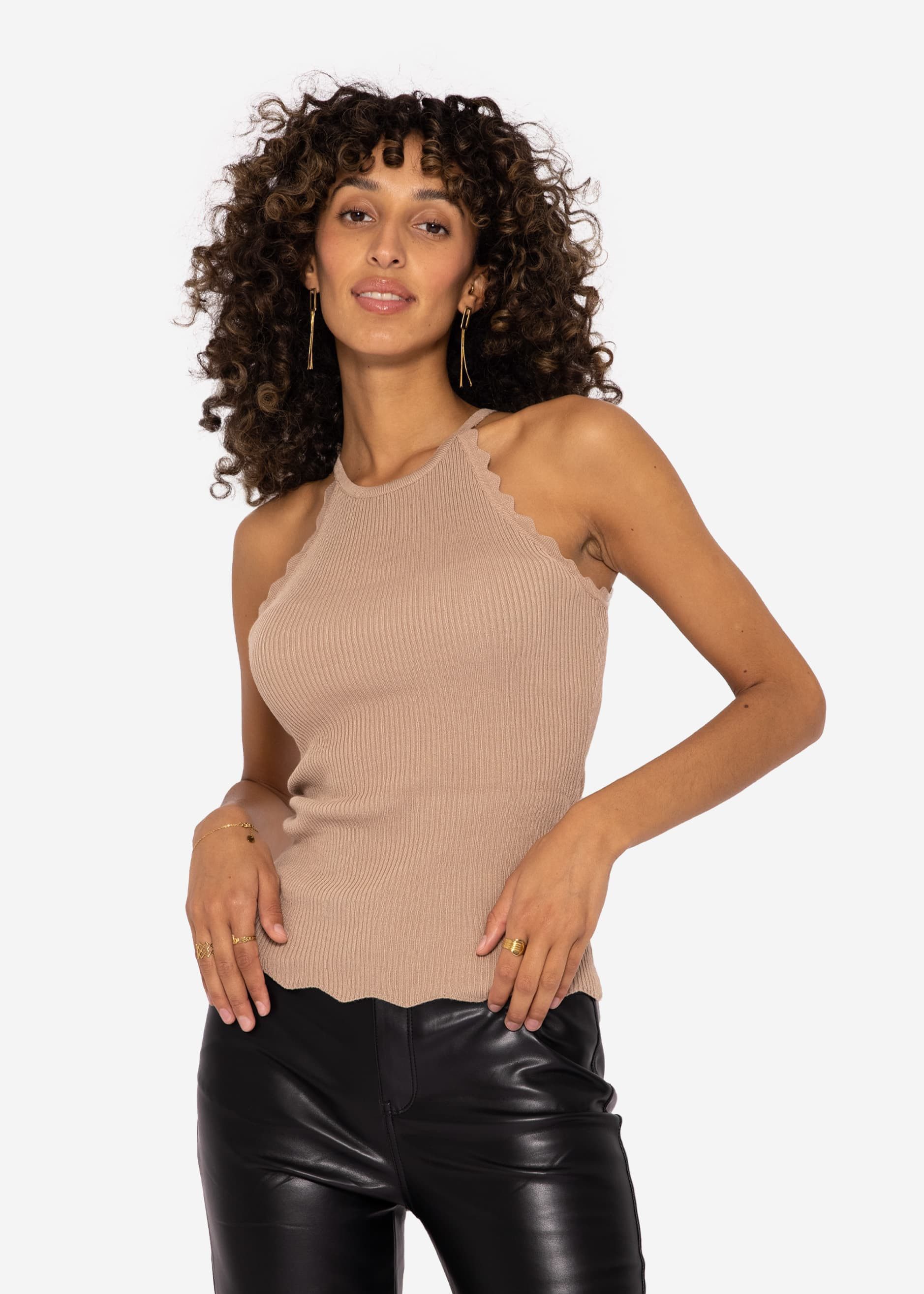 Besondere Merkmale | Feines Top aus Viskose Rippenstrick Camel Schwarz Weiß |
