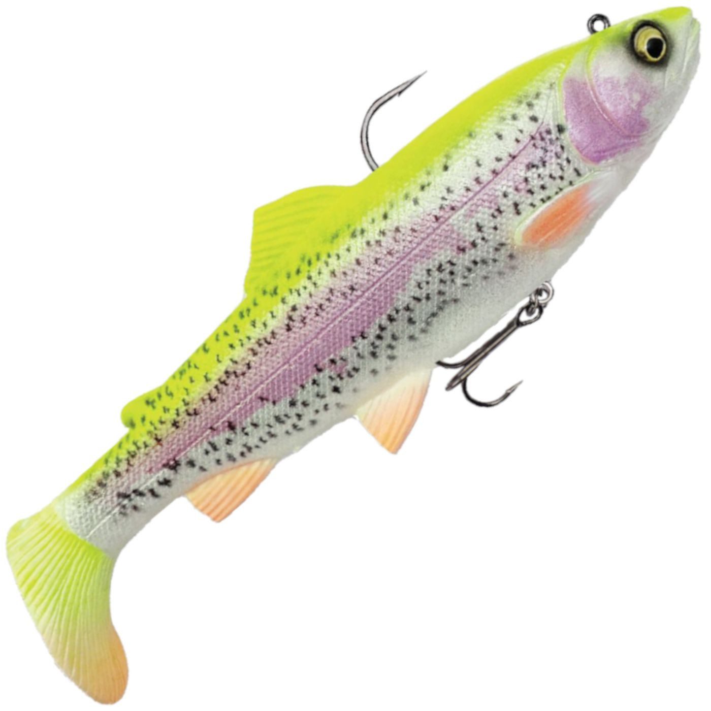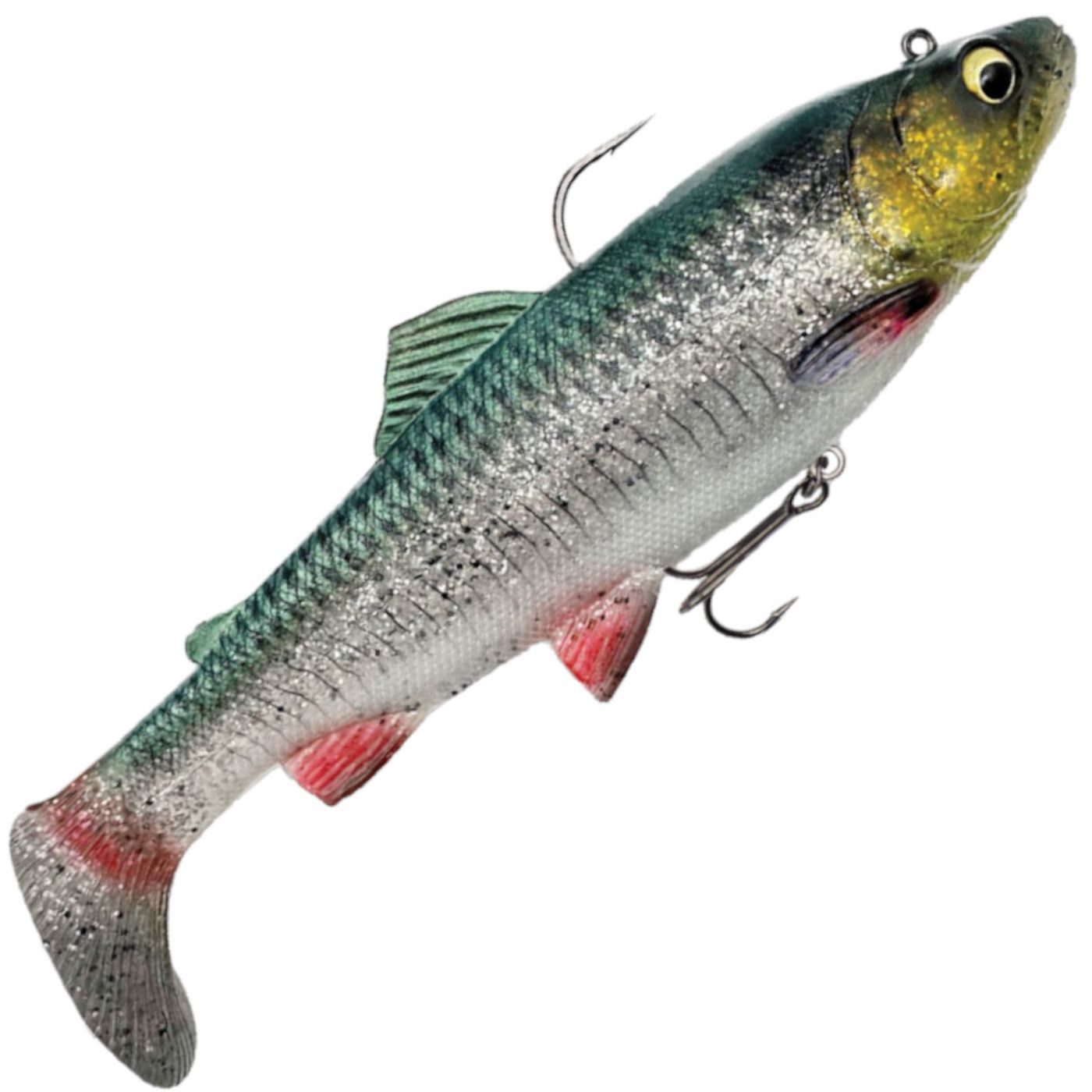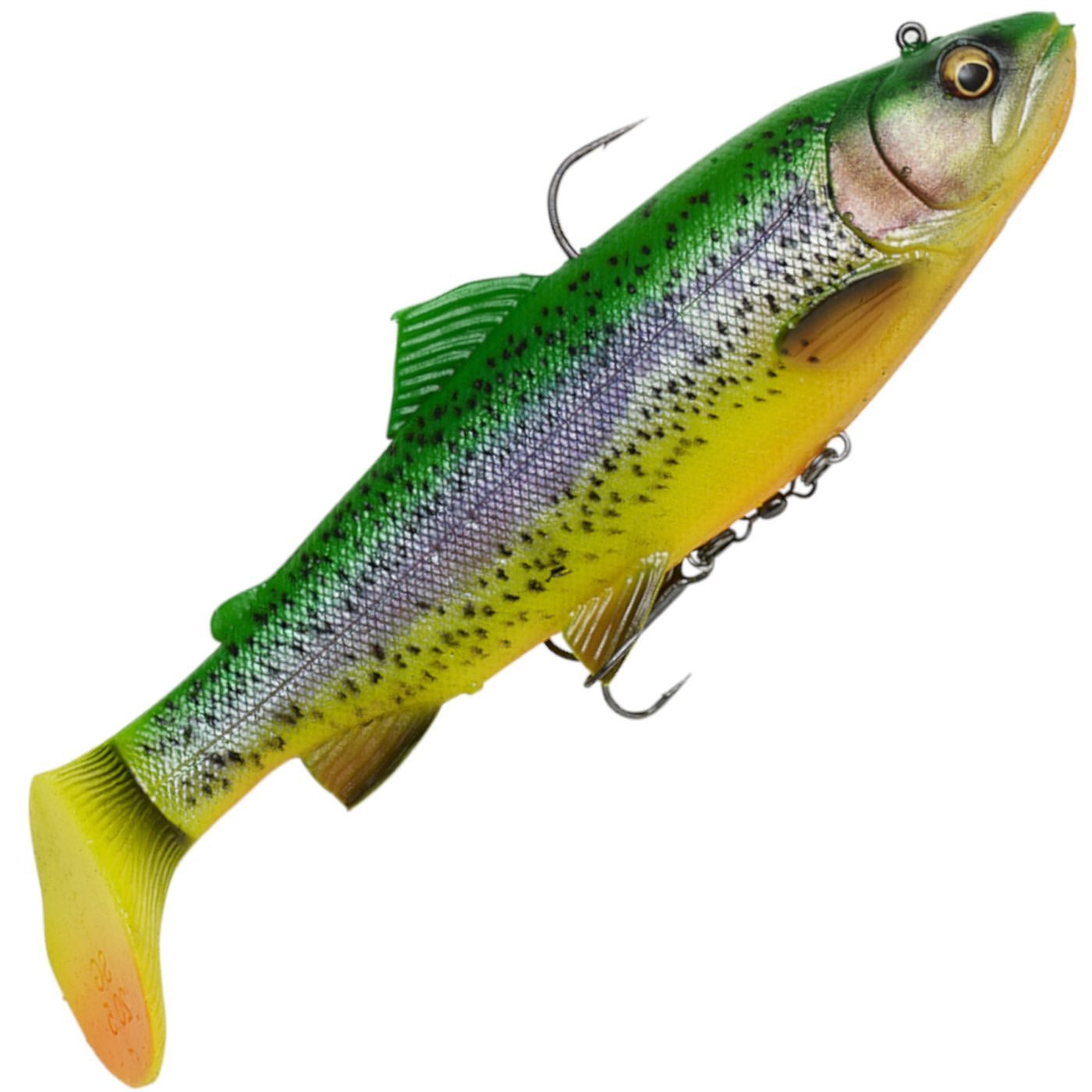 Savage Gear 4D Rattle Trout Gummifisch Forelle - Hechtköder - Die Gummiköder von Savage Gear sehen aufgrund der 4-D Foto-Haut einer echten Forelle zum Verwechseln ähnlich, wobei aber nicht nur das Design, sondern auch das Schwimmverhalten fast naturgetreu nachgebildet wurde. Die Gummiforelle macht rollende und muntere Schwimmbewegungen, wodurch sie Schallwellen absendet und selbst vorsichtige sowie misstrauische Raubfische zum Anbiss locken kann. Des Впередen besitzt der Softbait am oberen Schwanzende eine Vorrichtung für eine Rassel, so dass der mit einer Rassel kombinierte Kunstköder einen zusätzlichen Lockreiz absendet. Die Gummifische eignen sich sehr gut zum Wurfangeln vom Ufer sowie zum Schleppangeln vom Boot auf Hechte. Die scharfen Raubfischhaken sorgen für einen guten Hakeffekt im harten Hechtmaul und aufgrund ihrer Stabilität können kapitale Großhechte problemlos ausgedrillt sowie gelandet werden.
