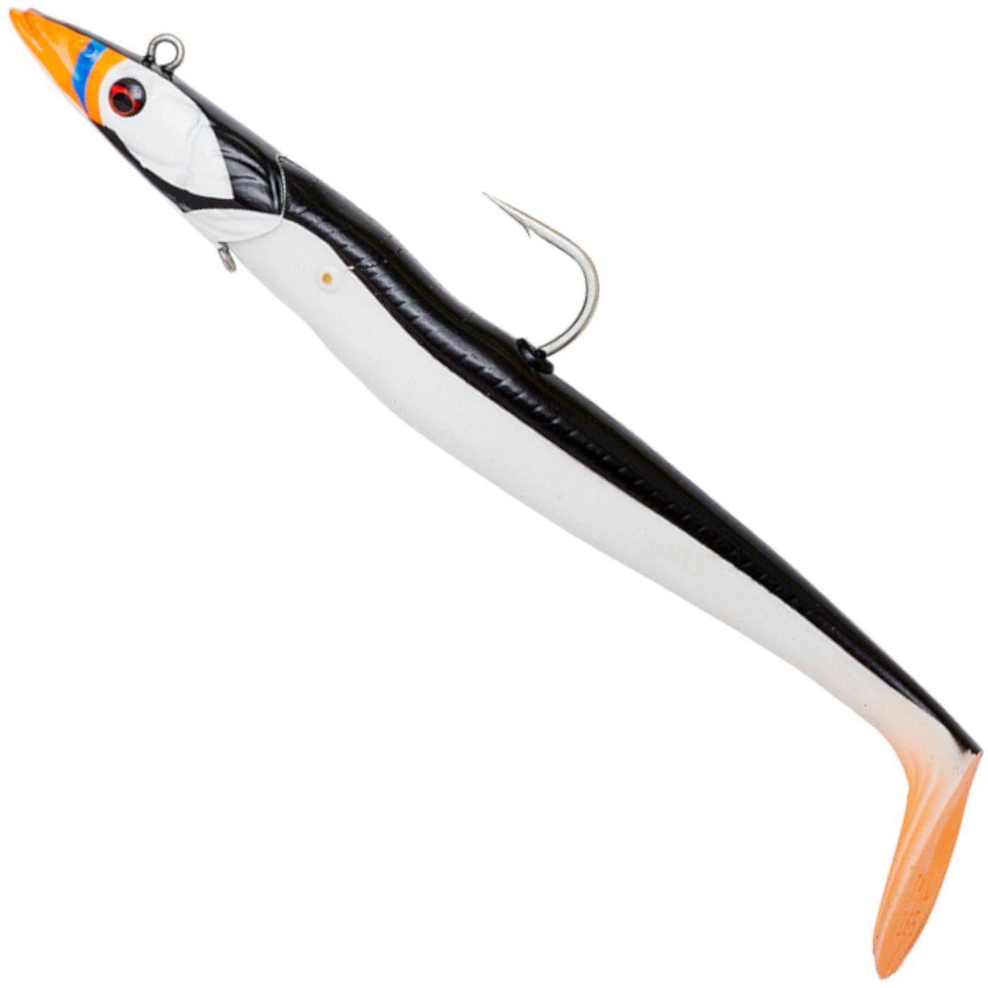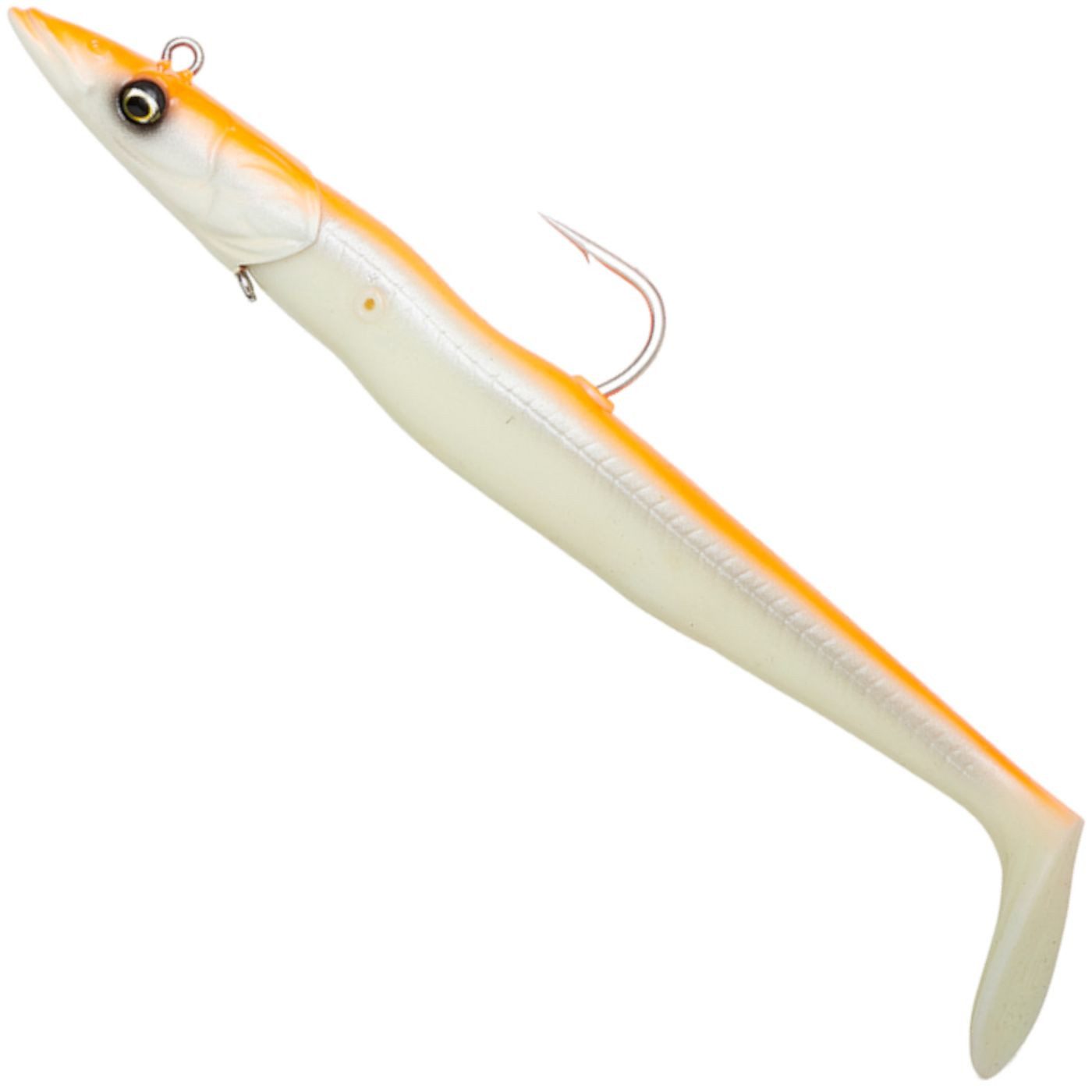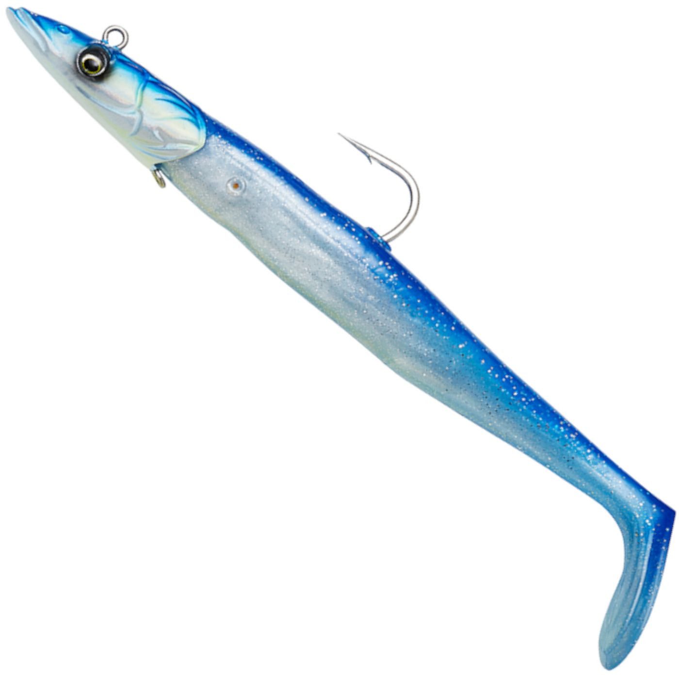 Savage Gear Sandeel V2 Big Game 21,5cm 140g - 2 Shads + 1 Jigkopf - Der Gummiköder von Savage Gear ist eine gute Imitation eines Sandaals. Er besitzt eine lebhaft schlagende Aktion, sowohl beim Absinken als auch beim Starten des Köders. Der Rise & Stand Up Jigkopf sorgt für einen guten Lauf des Köders in vielen Situationen. Beiliegende Zahnstocher ermöglichen es, dass der Körper am Kopf gesichert werden kann. Im Gummiköder ist eine Glasrassel vormontiert, die dem Kunstköder einen provozierenden Klang verleiht.