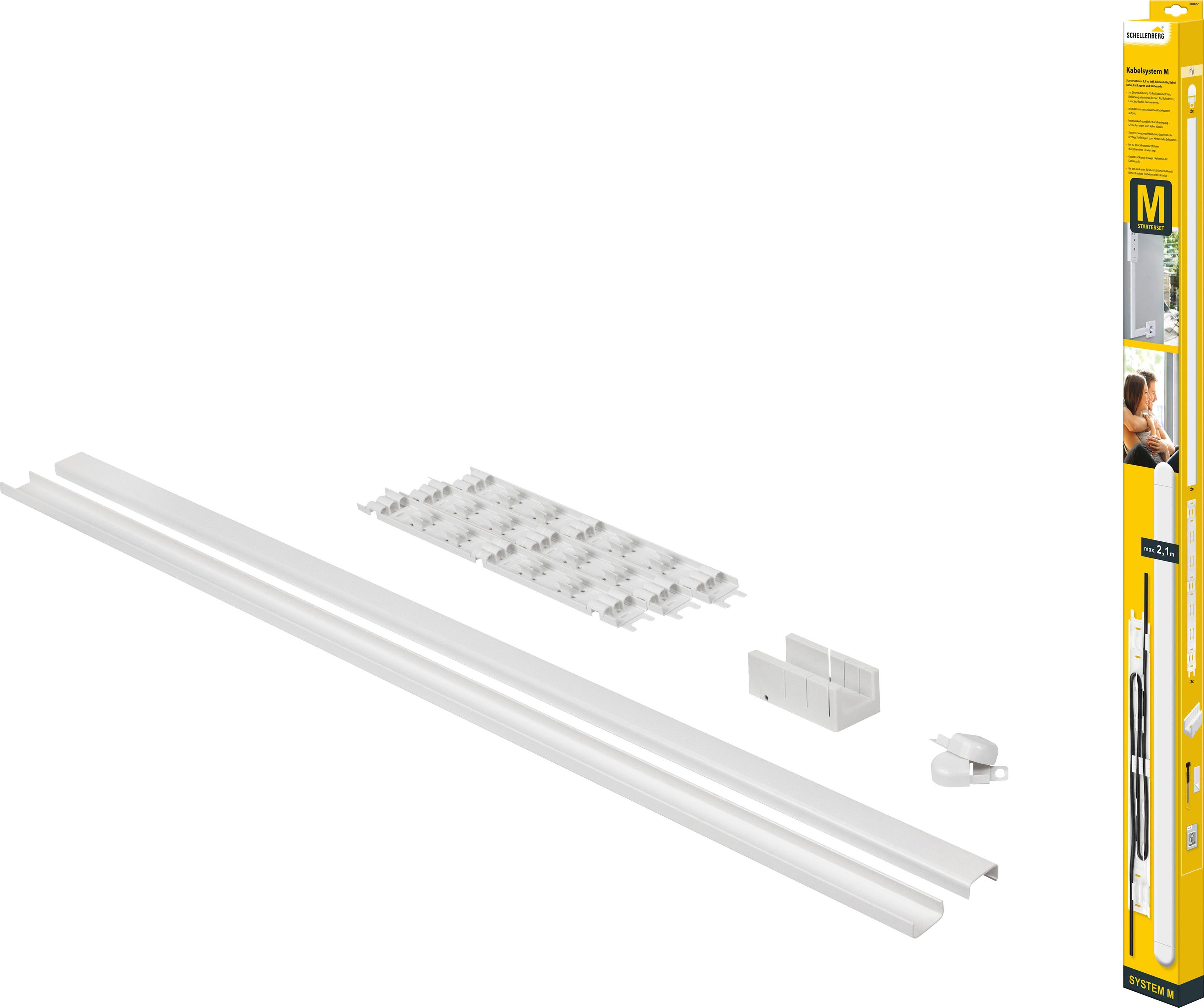 Mit dem Starterset des innovativen Kabelkanals System M in Weiß sorgen Sie für eine geordnete Kabelführung von zu langen Stromkabeln. Im Vergleich zu herkömmlichen Kabelkanälen befinden sich bei dieser Ausführung Klammern und Fixierstege auf den Basisplatten. Das ermöglicht, ein Stromkabel in Schlaufen zu legen, statt es zu kürzen. So bleibt das Stromkabel im Original erhalten und somit auch die Garantie des Geräts. Wie viele Kabel in dem Kabelkanal Platz finden, hängt von der Anwendungsweise ab. Sie können beispielsweise bis zu 3 Stromkabel mit einem Durchmesser von je 9 mm nebeneinander ordnen oder ein Stromkabel in Schlaufe legen. Für die Befestigung des Aufputz-Kabelkanals können Sie Schrauben oder die im Lieferumfang enthaltenen Klebepads nutzen. Das Starterset des Kabelkanal M hat eine Gesamtlänge von 2,1 m. Möchten Sie den Kabelkanal zuschneiden, um ihn in der Длина zu kürzen, empfehlen wir hierfür die Verwendung einer feinen Metallsäge. Anschließend können Sie mithilfe einer Feile die Kanten glätten. Für einen sauberen Zuschnitt auf Gehrung befindet sich im Lieferumfang des Startersets eine zum Kabelkanal System M passende Schneidhilfe. Mit Nuten im Winkel von 45° und 90° sowie einer integrierten Bohrschablone für die Endkappen vereinfacht sie die Montage. Die Endkappen bieten einen sauberen Abschluss des Kabelkanals und mit vier Möglichkeiten für den Kabelaustritt eine maximale Flexibilität. Möchten Sie den weißen Kabelkanal Ihrer Wohnumgebung noch besser anpassen, können Sie ihn mit jeder beliebigen Wandfarbe problemlos überstreichen.