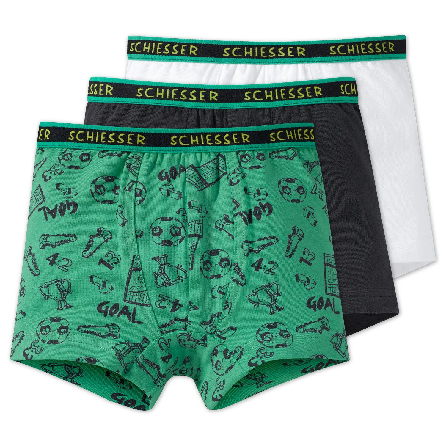 In tollen Farben und wunderbar bequemem Material werden diese drei Jungenshorts zum superstarken Wäsche-Trio! In Weiß, Anthrazit und Grün mit Fußball-Alloverprint sehen die Shorts nicht nur klasse aus, sondern fühlen sich in elastischem Single Jersey zudem herrlich soft an. Der schmale, anthrazit-gelbgrüne Logo-Webgummibund setzt das bequeme i-Tüpfelchen. Genau das Richtige für fröhliche Jungen, die die Welt am liebsten in bester SCHIESSER-Qualität für sich entdecken.