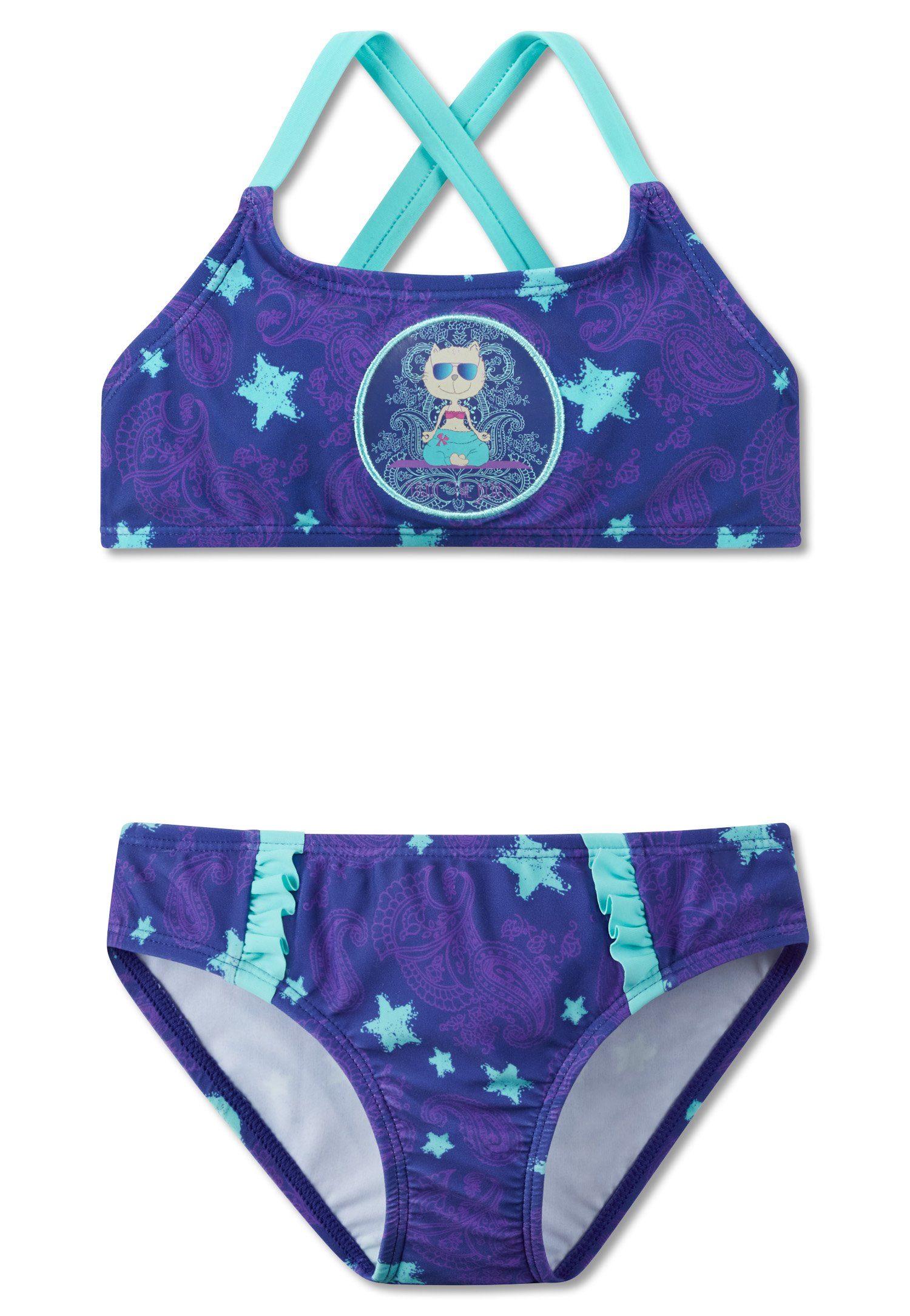 Dieser dunkelblaue Mädchen-Bustier-Bikini ist in seinem coolen Look ein absoluter Hingucker! Mint-farbene Sterne tummeln sich querbeet auf einem lila-farbenen Paisley-Muster und passen prima zu den mint-farbenen Rüschen am Slip und den farblich passenden Trägern. Das Highlight aber ist unser Yoga-Kätzchen Zoe, das in einer hübschen Applikation auf der Brust eine entspannte Sitzposition zeigt. Obendrein ist das softe Material mit LSF40+ ausgestattet und natürlich in bester SCHIESSER-Qualität.