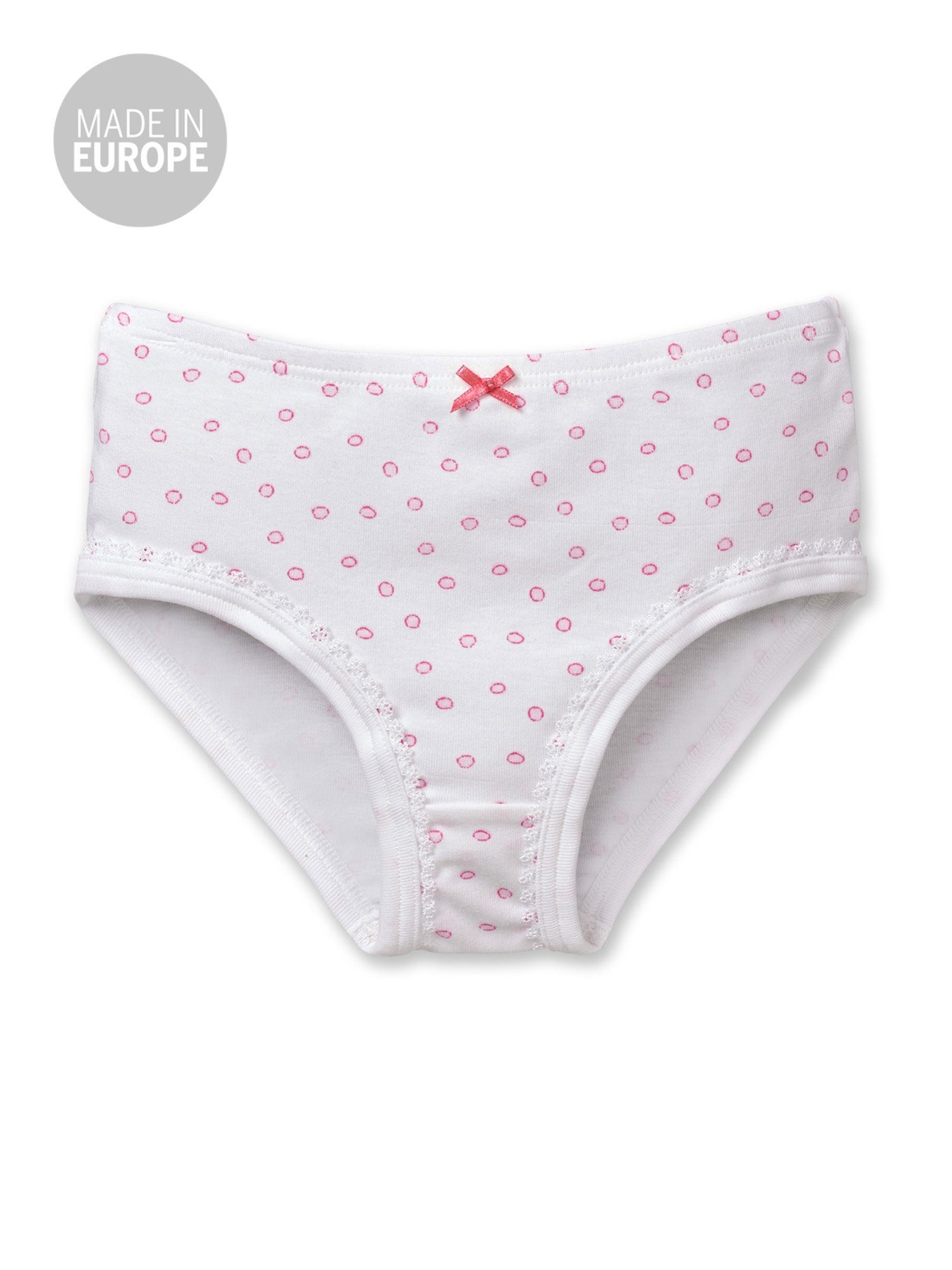 Tupfen zum Verlieben: Dieser weiße Mädchenslip wickelt fröhliche Girls mit seinem zauberhaften Look und softem Material um den Finger! Rosafarbene Tupfen, ein feines Schleifchen und die zarte Verzierung am Beinabschluss schenken dem Hüftslip nicht nur einen mädchenhaften Charme, sondern fühlen sich in hochwertiger, elastischer Feinripp-Qualität dabei auch noch herrlich weich und anschmiegsam an! Ideal für Mädels, die traumhaft-süße Wäsche in bester SCHIESSER-Qualität mögen!