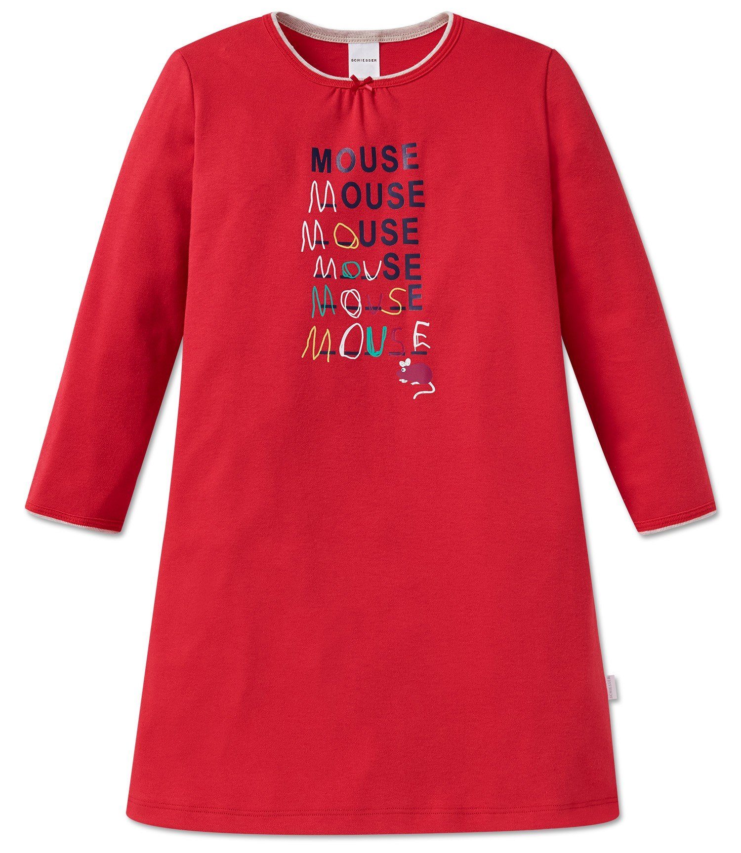 In diesem roten, langärmeligen Nachthemd können sich fröhliche Mädchen rundum wohlfühlen! Hochwertiger Interlock aus 100% feiner Baumwolle fühlt sich dabei nicht nur wunderbar warm und weich an auf der Haut, sondern sieht mit dem witzigen Mouse-Motiv auf der Brust, einem fein gekräuselten Halsausschnitt mit Schleifchen sowie mit den zweifarbigen Flachrändern an Hals- und Armausschnitt dabei auch noch klasse aus. Genau das Richtige für schöne Träume in bester SCHIESSER-Qualität. Mit großem Mouse-Motiv auf der Brust, feine Kräuselungen und Zierschleifchen am Halsausschnitt, zweifarbig geringelte Flachrand-Verarbeitung am Hals- und Armausschnitt in Cremeweiß-Melange, kleines SCHIESSER-Flag an der Seitennaht, in herrlich weicher, warmer Interlock-Qualität.