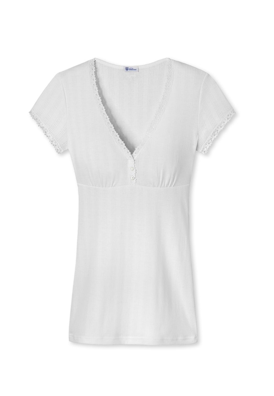 Aus lieblichem Feinripp-Ajourée mit floraler Bandspitze am Dekolleté und den Ärmelausschnitten