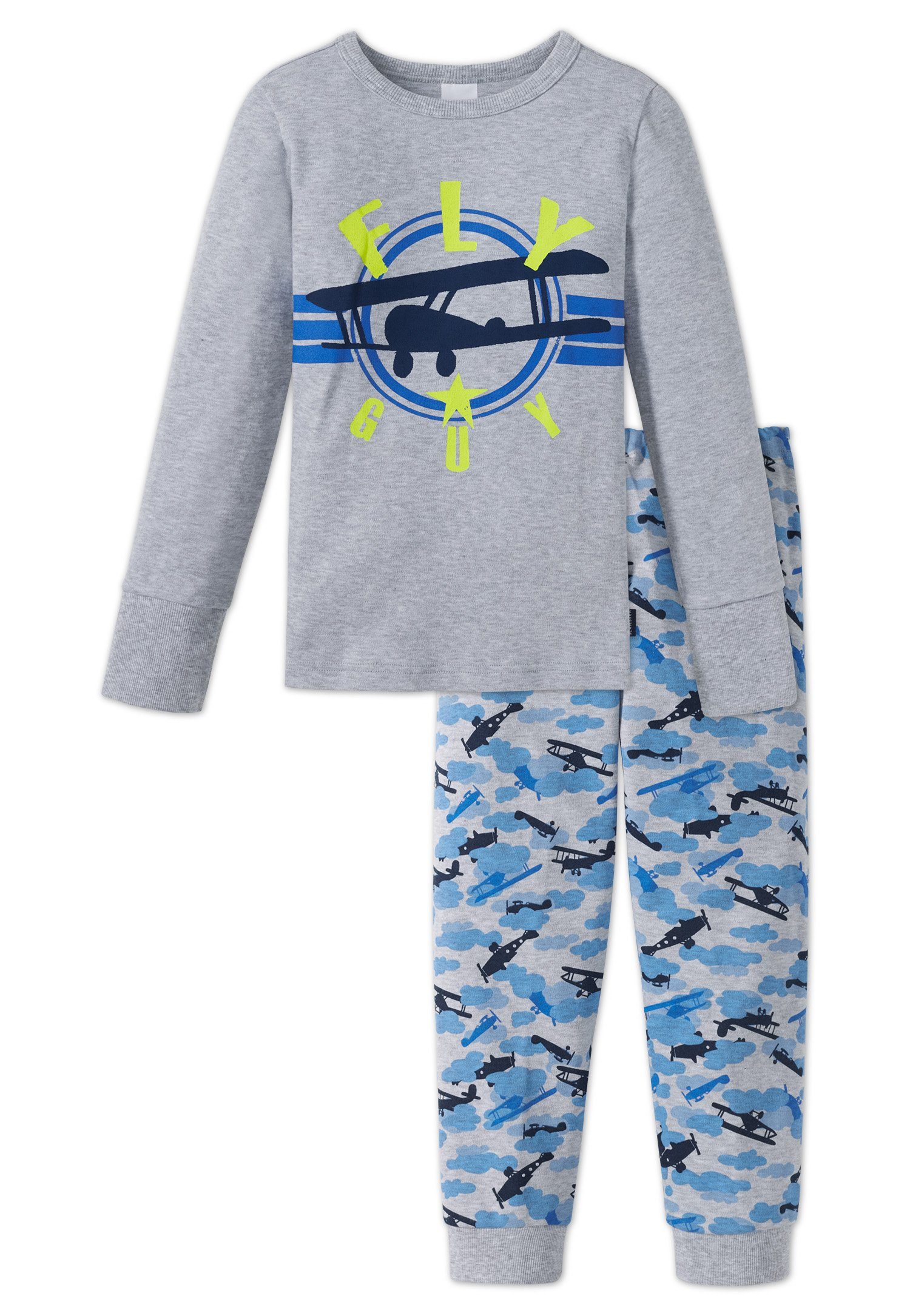 Dieser lange Jungenschlafanzug ist genau das Richtige für angehende Mini-Piloten! Das grau melierte Oberteil sieht mit Doppeldecker-Flugzeug und dem gelben Schriftzug "FLY GUY" richtig klasse aus und passt prima zu der Hose mit Flugzeug-Wolken-Muster. In warmem, weichem Interlock aus 100% Baumwolle und mit den bequemen Bündchenabschlüsse können es sich kleine Flieger-Fans richtig gemütlich machen und spannende Träume in bester SCHIESSER-Qualität erleben. Mit bequemen Bündchen an den Arm- und Beinabschlüssen, grau meliertes Oberteil mit Doppeldeckerflugzeug und gelben Schriftzug "FLY GUY", kleines SCHIESSER-Label an der Seitennaht, Hose in Graumelange mit blauen Flugzeugen und Wolken im Alloverprint, Bündchen in Uni-Graumelange, in weicher, warmer Interlock-Qualität.