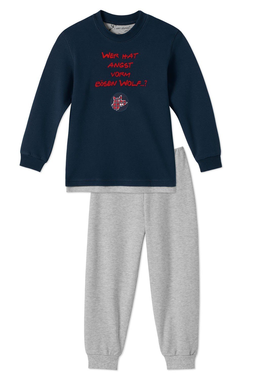 Ein Pyjama bestehend aus einem Jungen Schlafshirt und einer Schlafanzughose, mit einem Gebrüder Grimm Motiv "Böser Wolf". Im Halsspiegel befindet sich der Schriftzug "Es war einmal...200 Jahre Grimms Märchen".