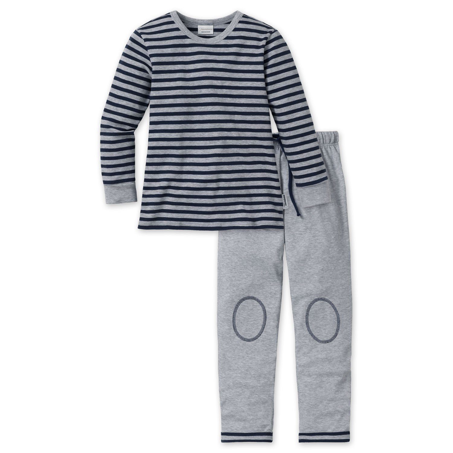 Dieser lange Jungenschlafanzug aus der exklusiven Tausendsassa-Kollektion kombiniert ein nostalgisches Design mit 100% erlesener Baumwolle. Grau melierte und blaue Streifen sowie die breiten Armbündchen schenken dem Oberteil einen gemütlichen Charakter, der ideal durch die lange grau melierte Hose mit Kordelzug, Kniepatches und geringeltem, fixierten Beinaufschlag abgerundet wird.