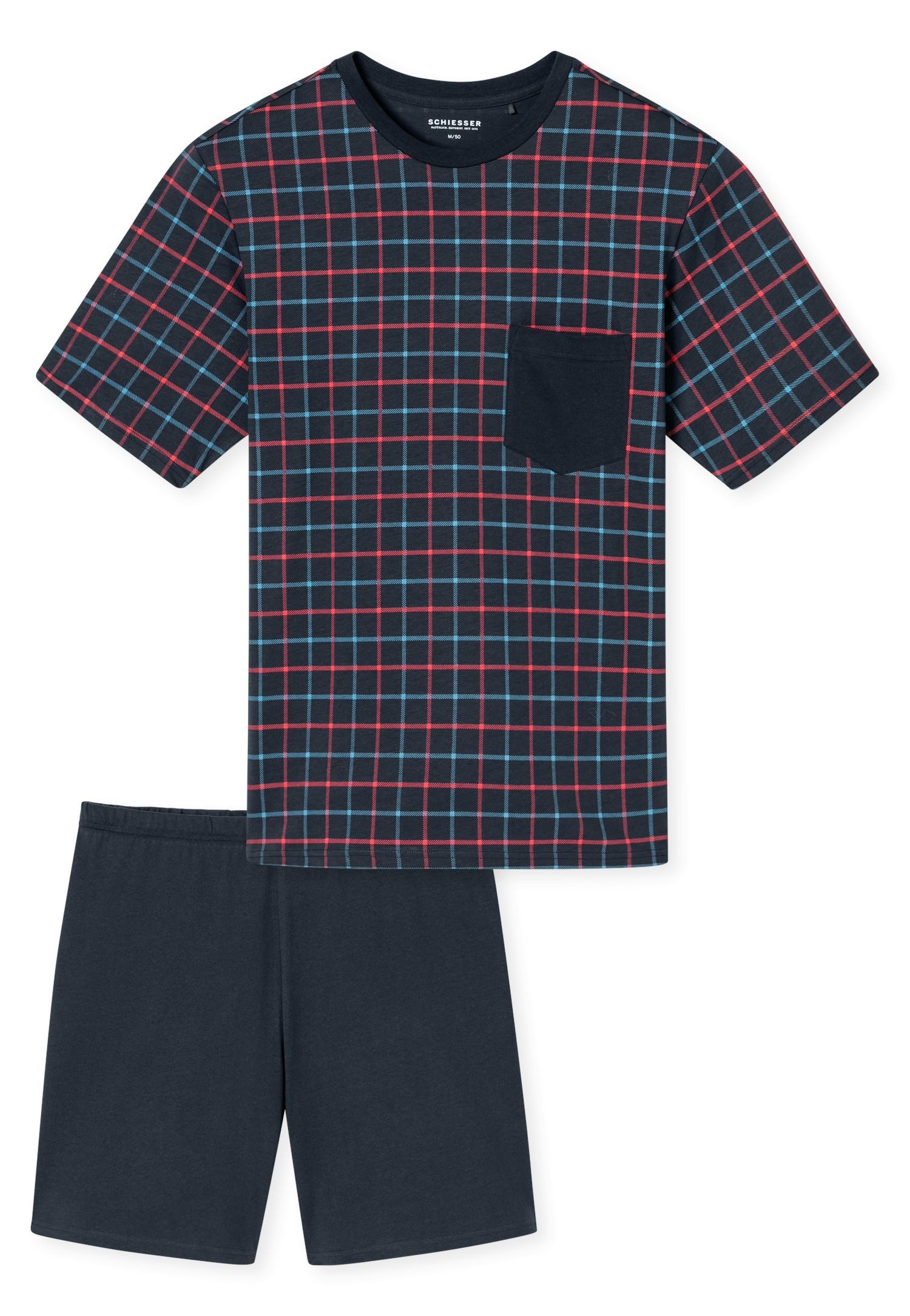 Anstrengender Tag? Atme tief ein und entspann dich mit diesem zweiteiligen Herren-Shorty aus der Comfort Essentials Serie von Schiesser. Das anschmiegsame Kleidungsstück ist kurz geschnitten. Und das bei normaler Leibhöhe. Das Shorty-Oberteil hat einen Rundhalsausschnitt. Seine Ärmel sind kurz. Die Hosenbeine sind gerade geschnitten. Den oberen Abschluss bildet ein elastischer Bund mit Gummizug. Die Ziertasche fällt unmittelbar ins Auge. Einen zusätzlichen optischen Akzent setzt eine Brusttasche.