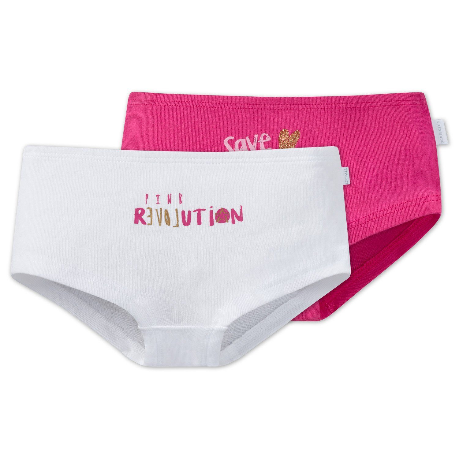 Diese beiden Pantys erobern im Sturm alle Mädchenherzen! Dafür sorgt jede Menge Pink, freche Sprüche und tolle Glitzereffekte, die sich einmal auf Pink mit Schriftzug "save the planet (I'ts the only one with chocolates!)" und im weiße Modell mit dem Spruch "PINK REVOLUTION" wiederfinden. Hochwertiger Feinripp aus 100% Baumwolle macht die Unterhosen wunderbar weich und bequem. Ein unschlagbarer Wäsche-Doppelpack für kleine Girlies - natürlich in bester SCHIESSER-Qualität.