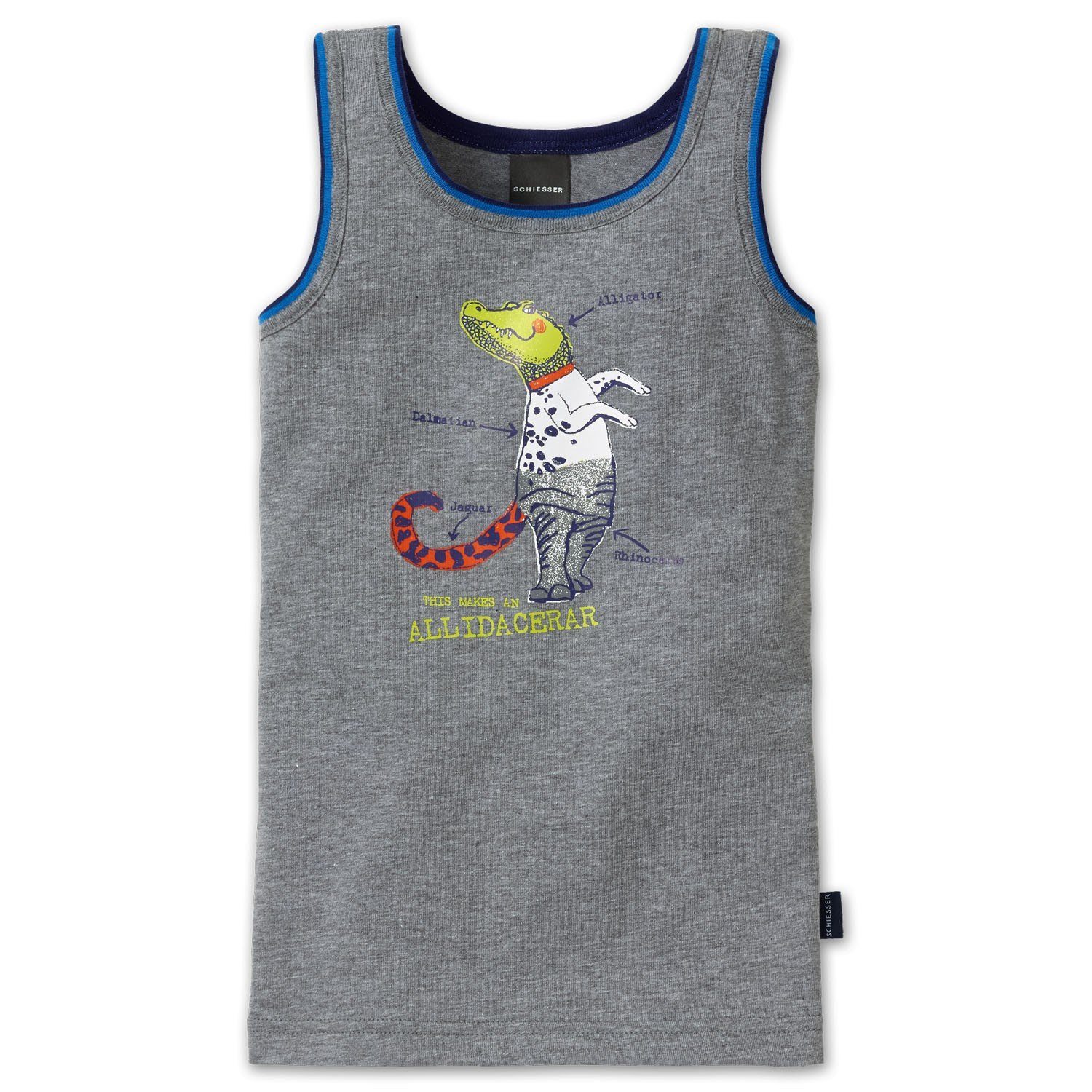 Ein Jungen Unterhemd mit frechem Motiv in Single-Jersey Qualität. Das kunterbunte Fantasie-Tier auf der Brust und zweifarbige Flachränder an Hals- und Armausschnitten zaubern nicht nur im Nu ein Lächeln in jedes Rabauken-Gesicht, sondern machen in elastischem Single Jersey dabei auch noch jeden Quatsch mit.
