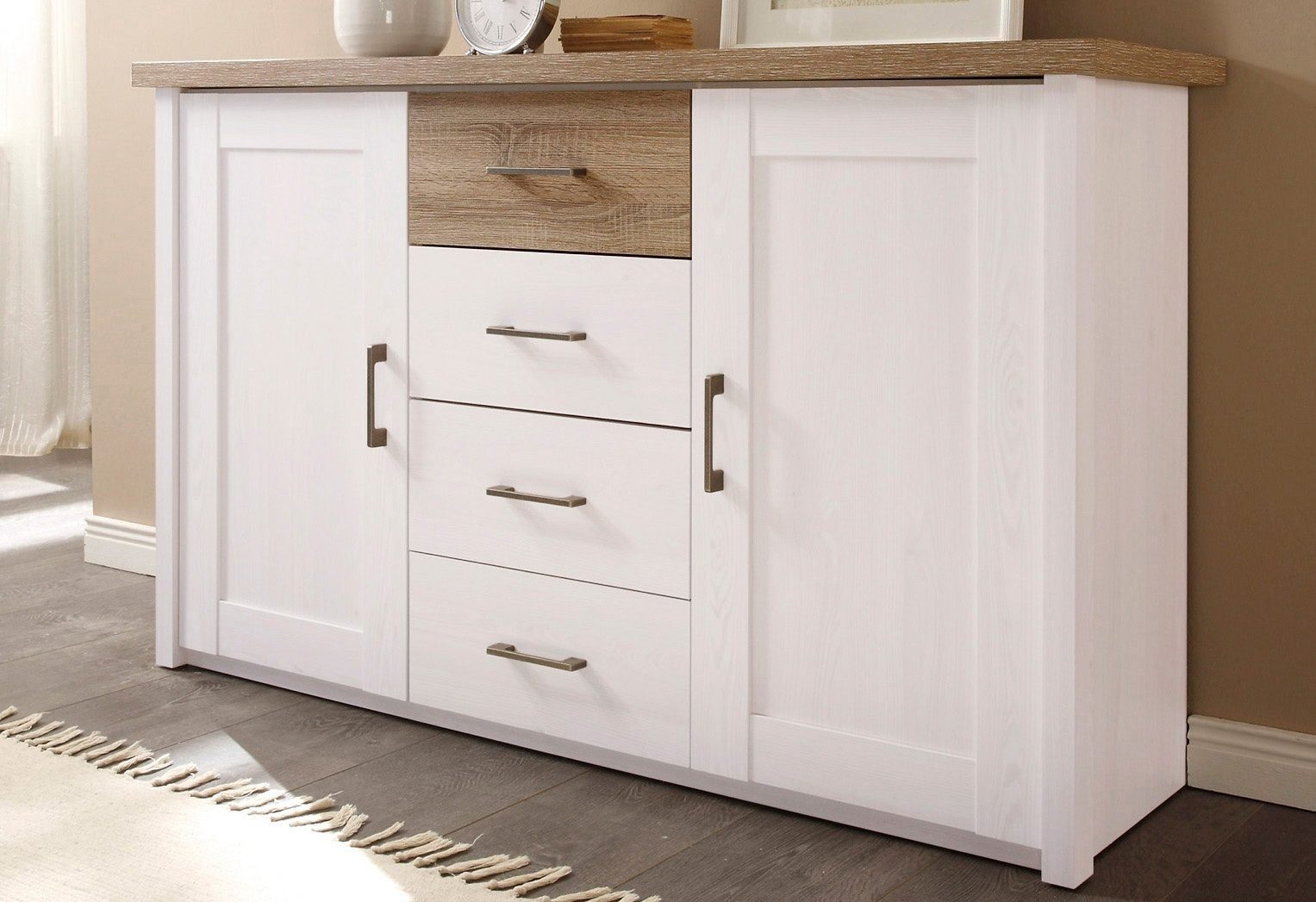 Wissenswertes | Schöne Kombikommode in der Farbkombination Piniefarben weiß mit Absetzung in Trüffelfarben. Mittig 4 Schubkästen, rechts und links jeweils 1 Tür, dahinter je 2 Böden. Pflegeleichte Kunststoffoberfläche. Beschläge und Scharniere aus Metall. Griffe aus antikfarbenem Metall. Schubkästen auf Metalllaufleisten. Innendekor in Pinie weiß. Все Maße sind ca.-Maße. Mit Aufbauanleitung. Details: