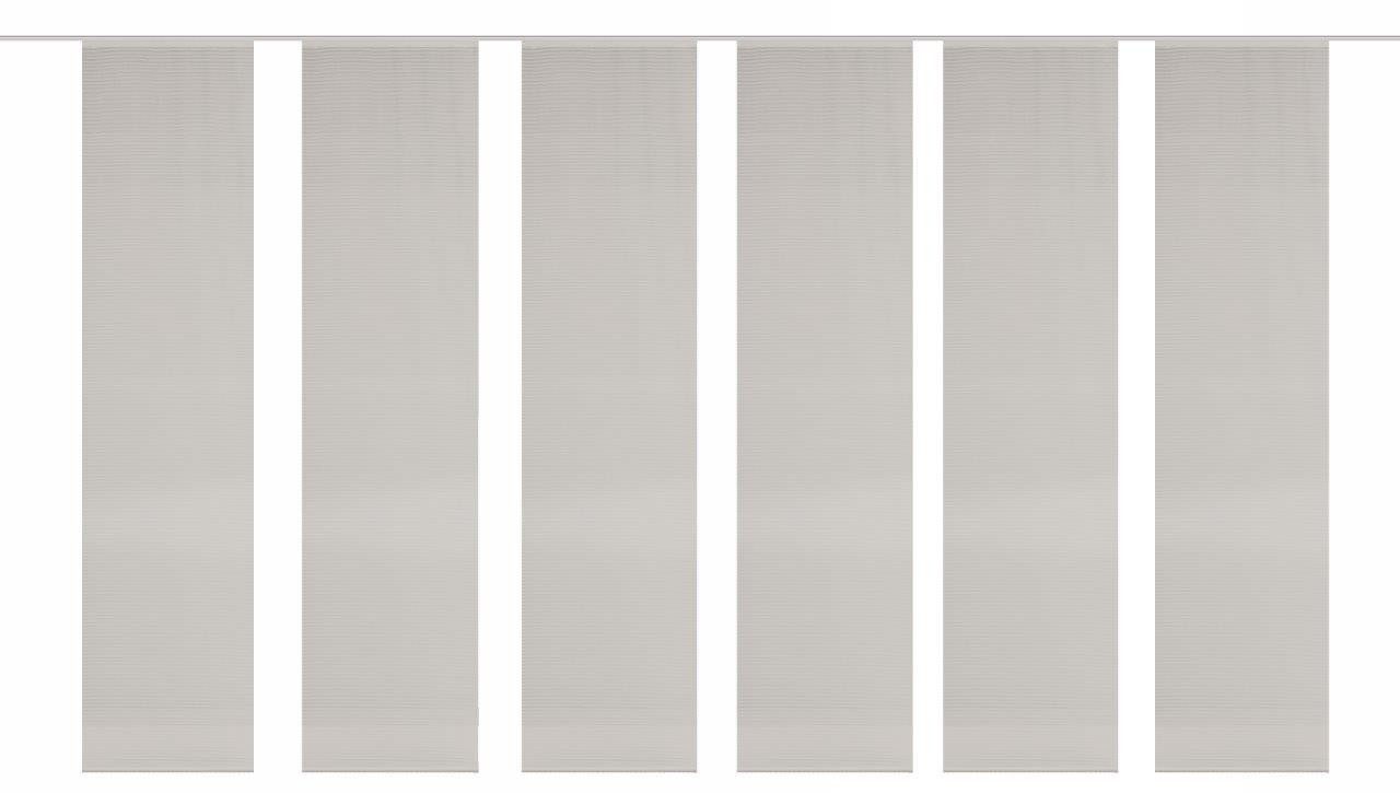 Lieferumfang: sechs (6) Schiebegardinen ROM. Die Lieferung erfolgt inkl. hochwertigem Zubehör: Paneelwagen mit Gardinenrollen und alternativen X-Gleitern für alle gängigen Gardinenschienen, Klemmschiene aus Aluminium als Beschwerungselement unten, Mitnehmer und Montageanleitung.