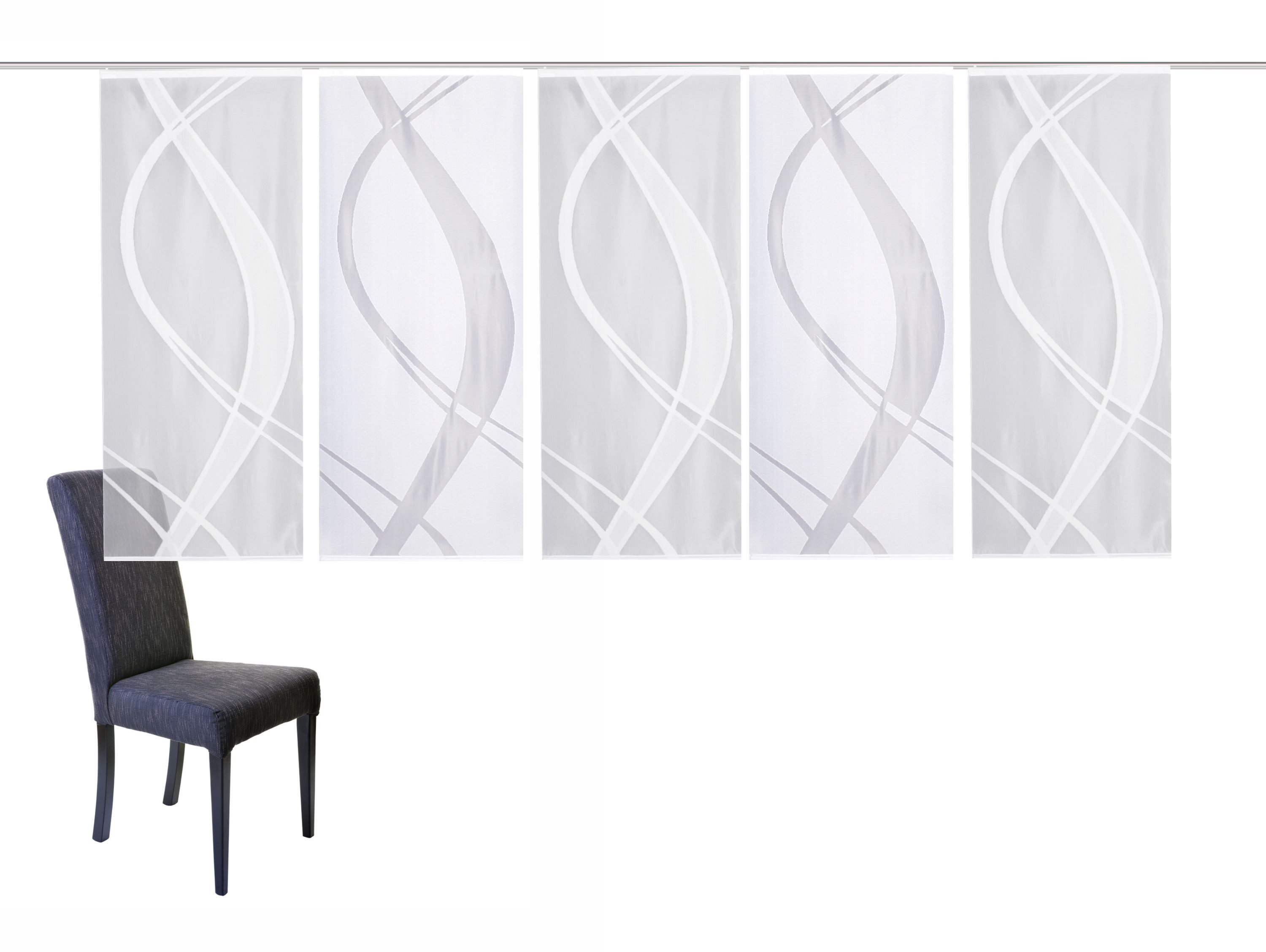 Die Schiebevorhänge in diesem Set bestehen aus weißer Jacquard-Wirkware. Drei Schiebevorhänge haben einen transparentem Grund und dichtem Wellen-Motiv und zwei Schiebevorhänge sind genau anders herum gewebt (dichter Grund mit transparentem Wellenmotiv).