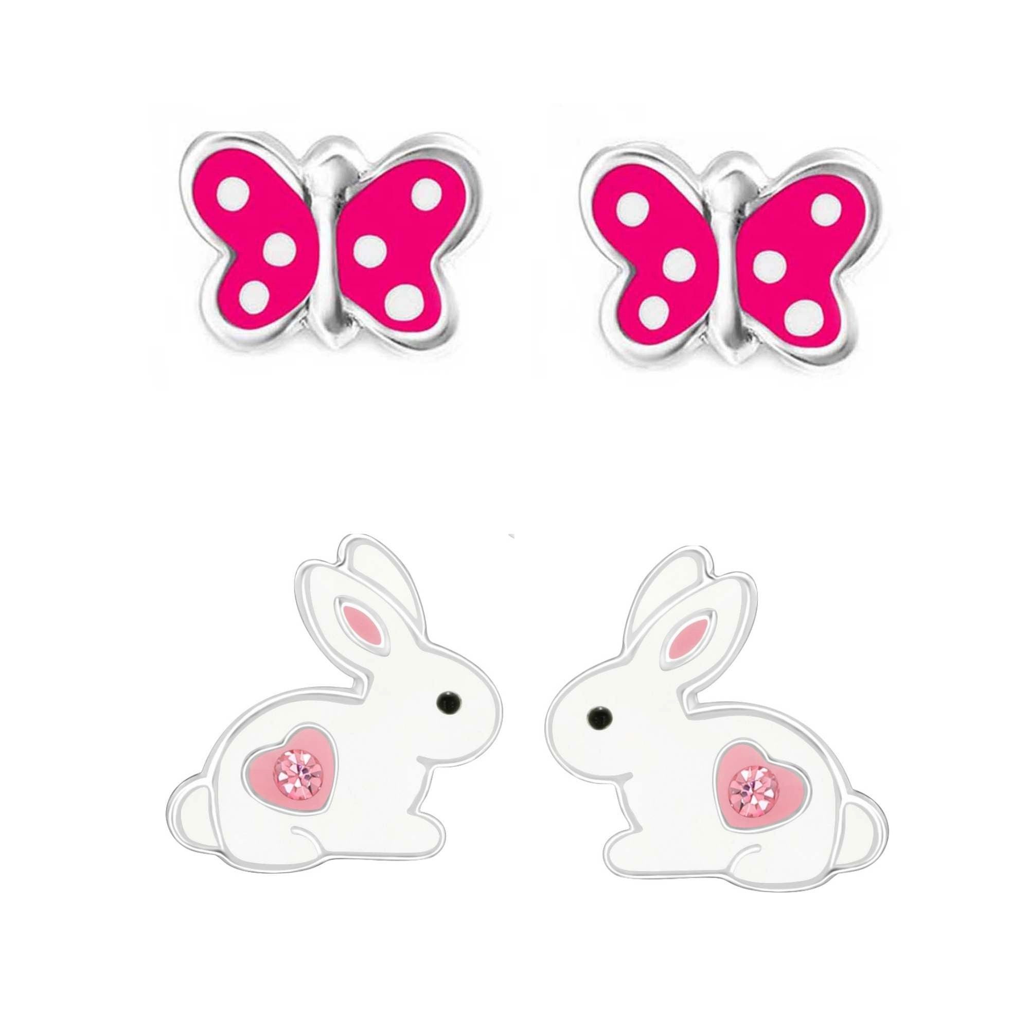 schmuck23 Ohrstecker-Set 2 x Kinder Ohrringe Hase Schmetterling 925 Silber Ostern (Geschenkset, Set aus 2 Paar Ohrringen), Mädchen Kinderschmuck 4 x Silikonverschluß extra