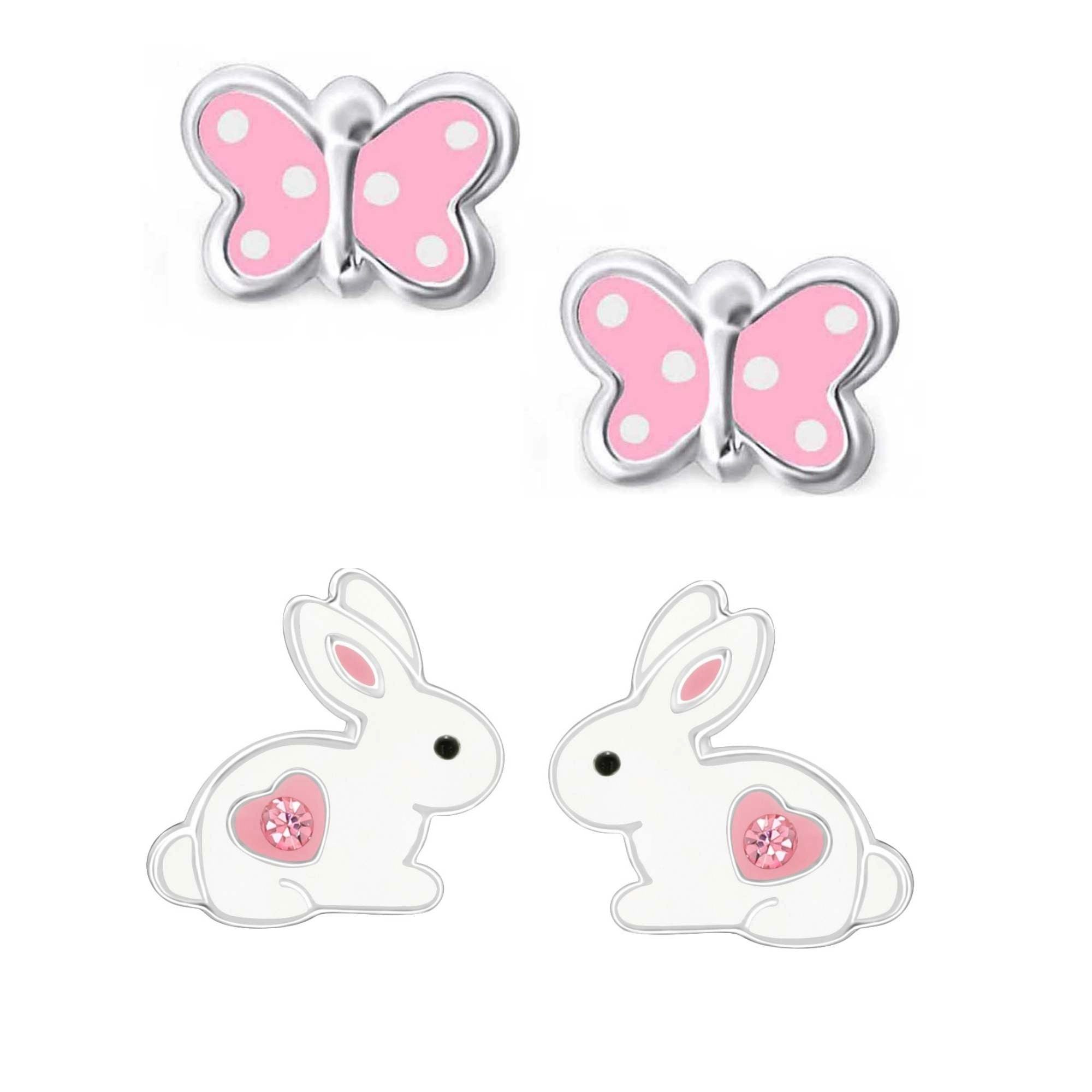 schmuck23 Ohrstecker-Set 2 x Kinder Ohrringe Hase Schmetterling rose 925 Silber Ostern (Geschenkset, Set aus 2 Paar Ohrringen), Mädchen Kinderschmuck 4 x Silikonverschluß extra