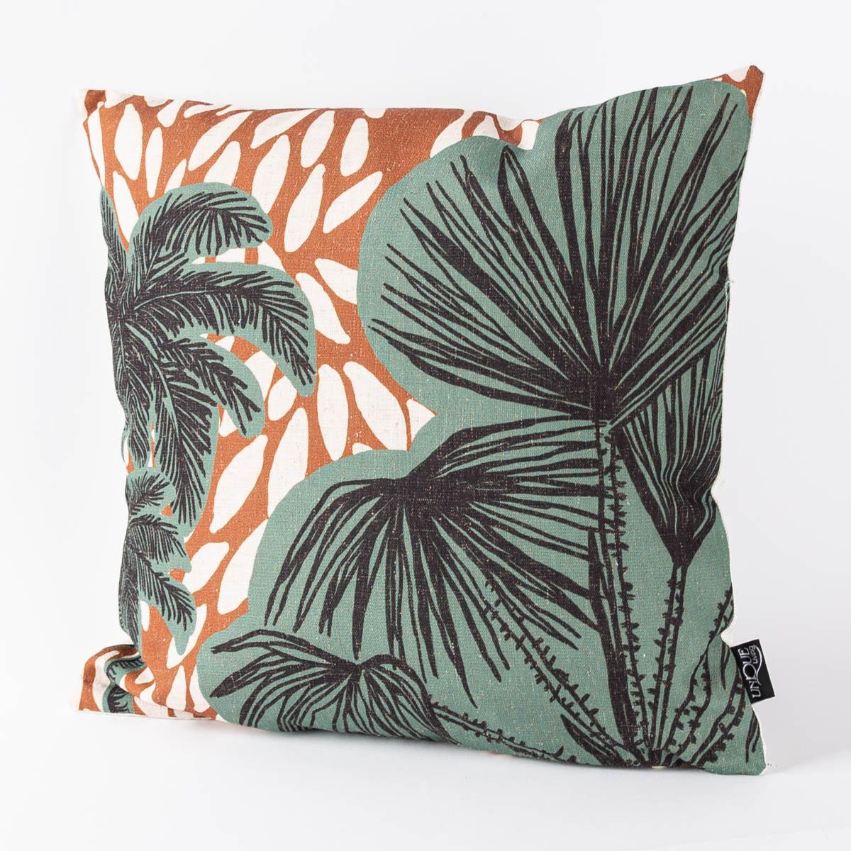 HINGUCKER FÜRS SOFA: Das Kissen mit modernem Palmen-Print ist überall ein Hingucker und setzt Sofa und Sessel neu in Szene.