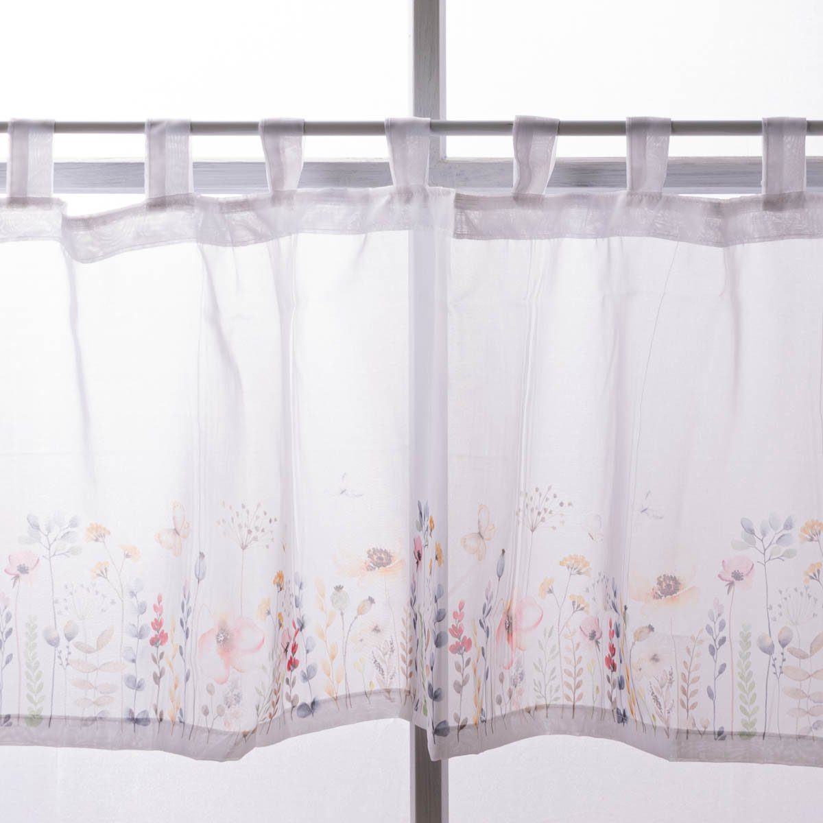VOILE SCHEIBENGARDINE: Die transparente Scheibengardine aus feinem, zarten Voile mit buntem Blumenprint ist ein frischer Hingucker für deine Fenster, der dir den Frühling ganzjährig in dein Zuhause bringt. Die Gardine kommt fensterfertig mit 10 dekorativen Aufhängeschlaufen zu dir nach Hause, du musst sie nur noch auspacken und aufhängen.