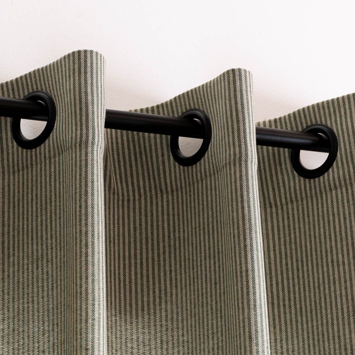 FRISCHES DESIGN: Der grün-beige gestreifte Vorhang mit schwarzen Metallösen von SCHÖNER LEBEN fügt sich mit seinem zeitlosen Muster nahtlos in verschiedenste Einrichtungsstile ein und sorgt für eine freundliche Atmosphäre in jedem Raum.